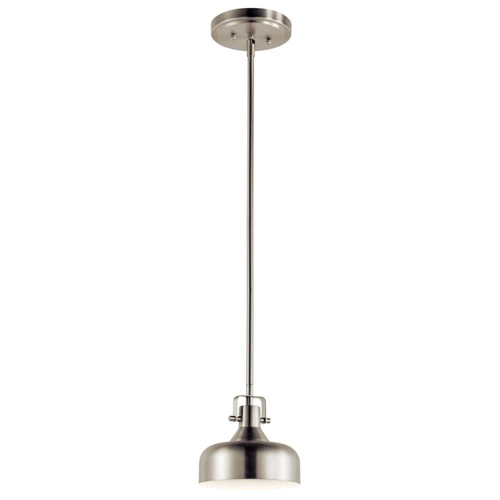 The Kichler 7 in. 1-Light Brushed Nickel LED Mini Pendant Light comes in an attractive design to enliven your transitional-style decor. Featuring an integrated LED lamp, this pendant light diffuses light to cast a warm and relaxing glow. The LED is fully dimmable, allowing you to control the brightness according to your preference. The frame is made of durable steel ensuring lasting use. It is ideal for illuminating your dining room, living room, bedroom, and more.