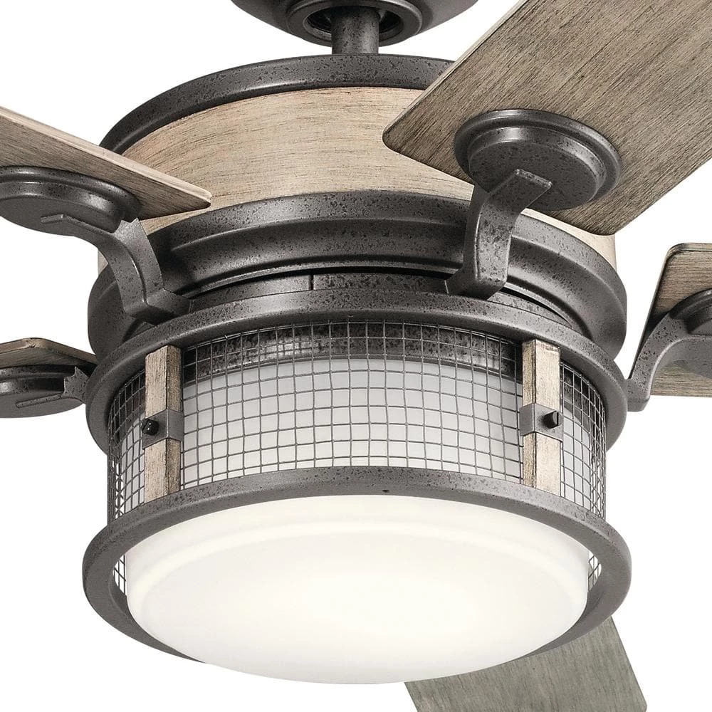 - Anvil iron hub finish and antique gray blade finish complement a transitional or industrial decor