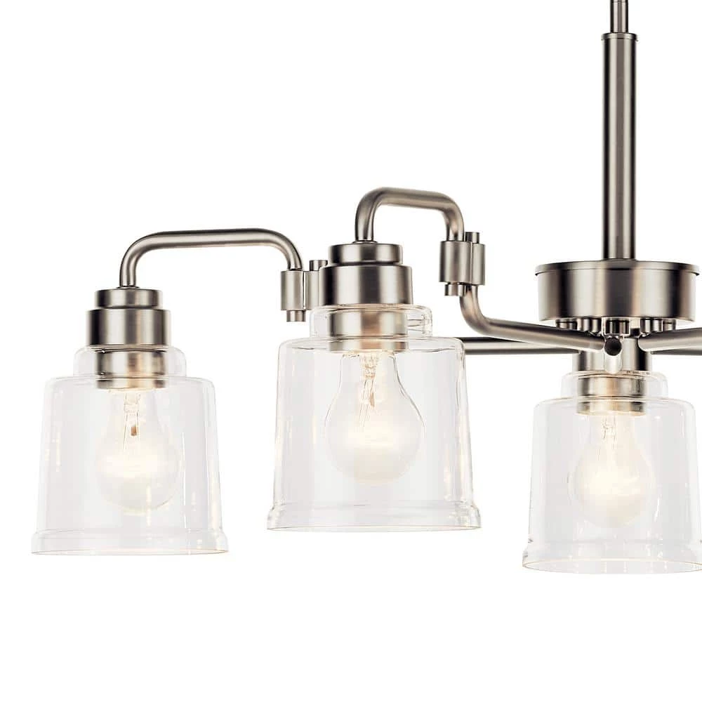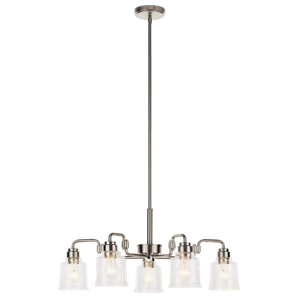 - The Aivian 30 inch 5 light chandelier features industrialstyle arms in an upscale Brushed Nickel finish and Clear Glass shades