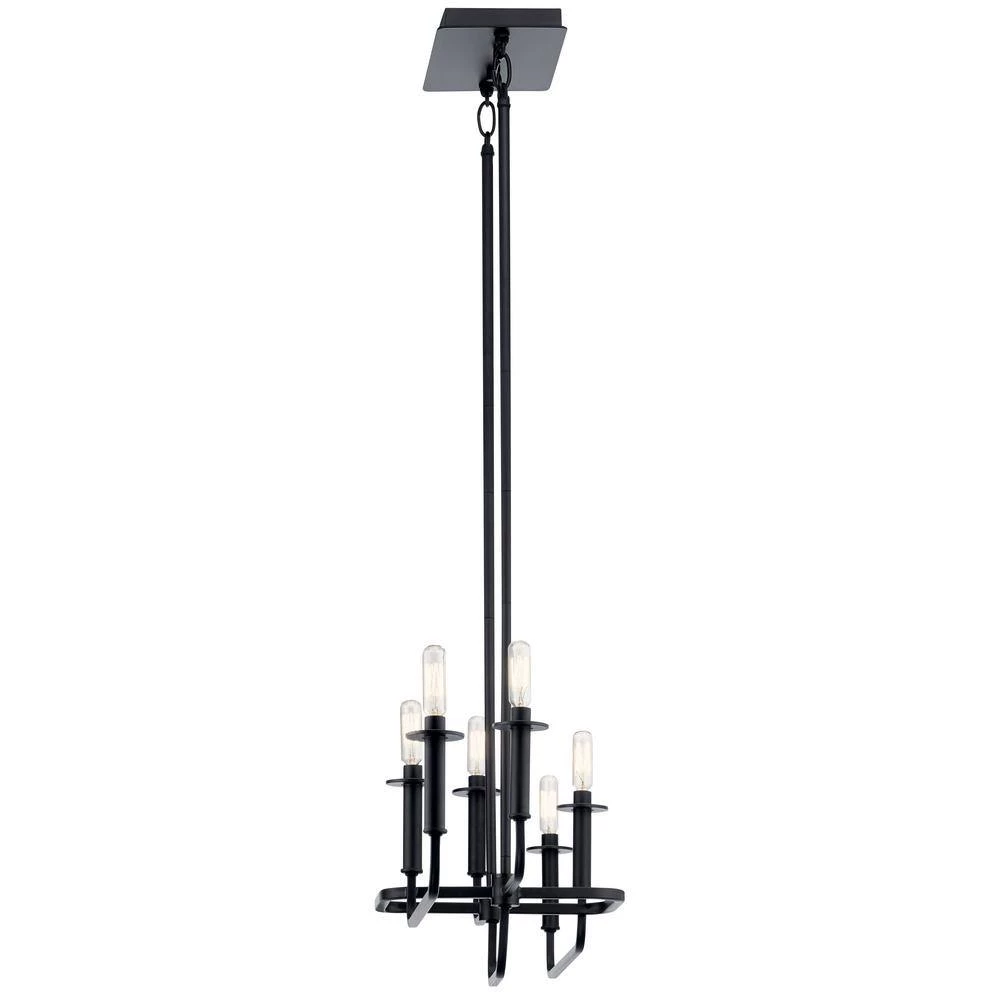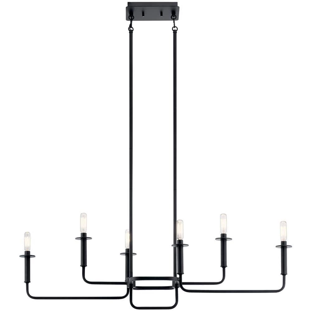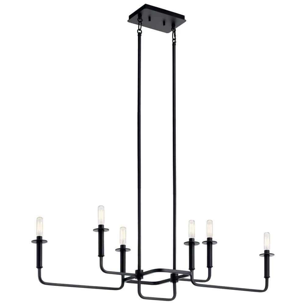 The KICHLER Alden 17.5 in. Black Linear Chandelier is the perfect combination of style and functionality. Its minimalist design is amplified by an asymmetrical linear pattern that reduces visual clutter and creates an attractive appearance. With its black finish, this chandelier creates an enhanced visual appeal in most interior settings. This fixture uses 6 incandescent bulbs to provide ambient illumination to any space.