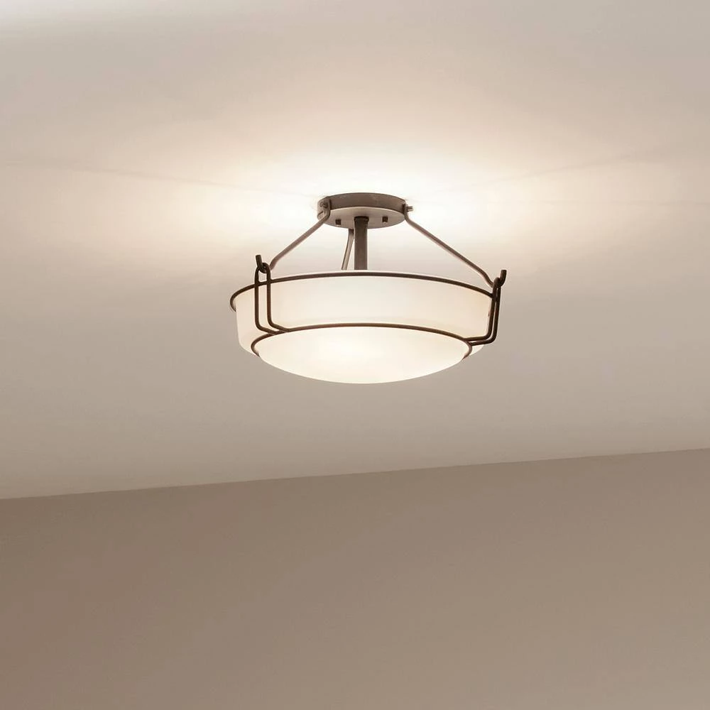 The Alkire 16.5 in. 3-light semi flush features a Luxe Industrial look with its Black finish and satin etched cased opal glass. The Alkire is inspired by machine-age aesthetics, with curved forms and horizontal lines that come together in brilliant style. Make a design statement with a style so unique and stunning, yet so classic, that it seamlessly highlights transitional and modern decor alike. Use in any indoor room or hallway.