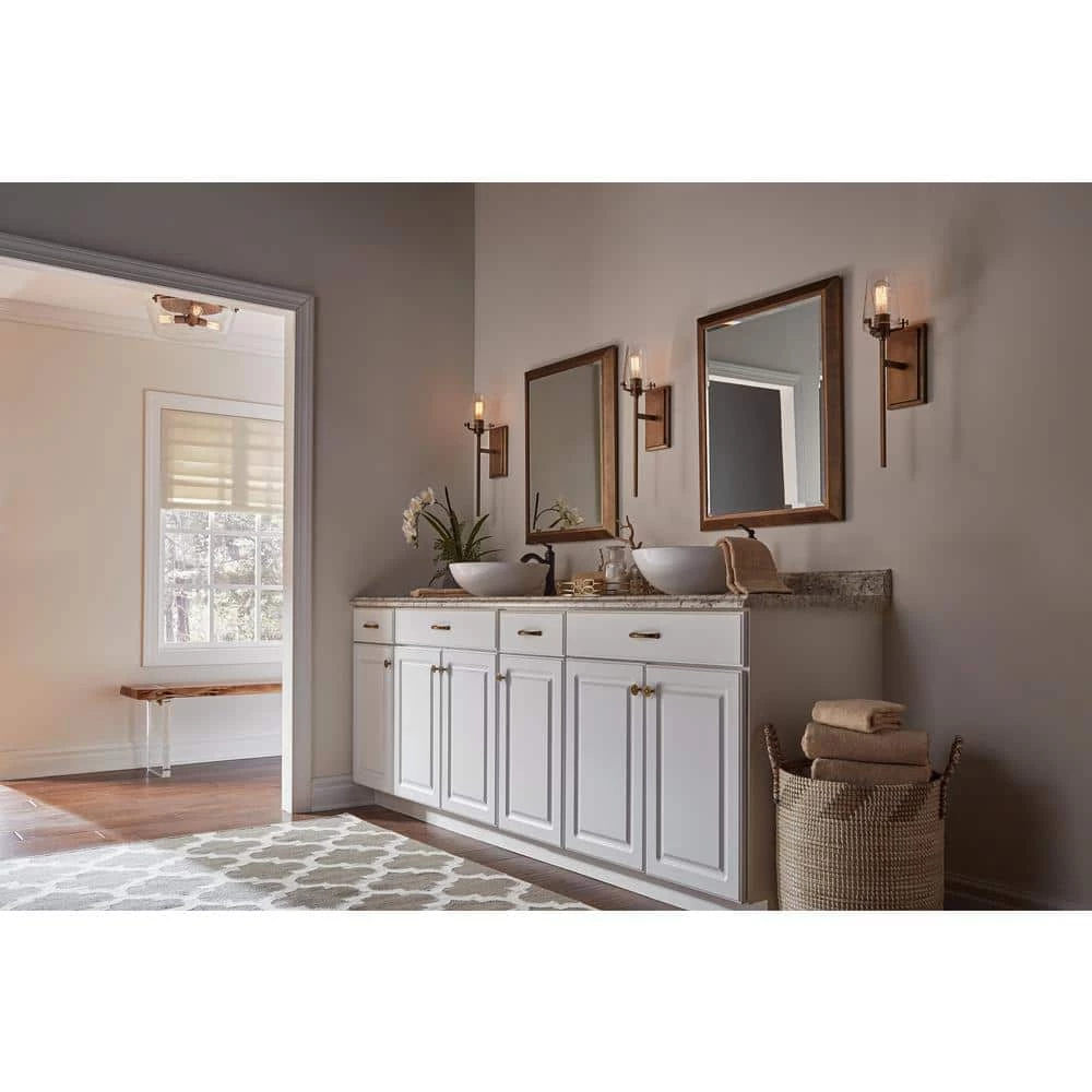 The KICHLER Alton 22 in. 1-Light Natural Brass Wall Sconce features the perfect combination of industrial-era detailing and modern style. Its nuts and bolt hardware accents create a unique look that is ideal for both traditional and modern decor. The clear seeded glass shade provides even illumination to your space. This fixture can be installed facing down or up as per your requirements: turn the shade down to highlight a mirror or an art piece or turn it up, towards the ceiling for a soft ambient light appeal.