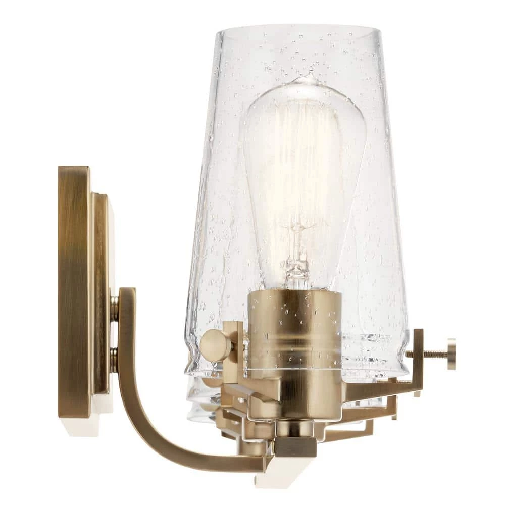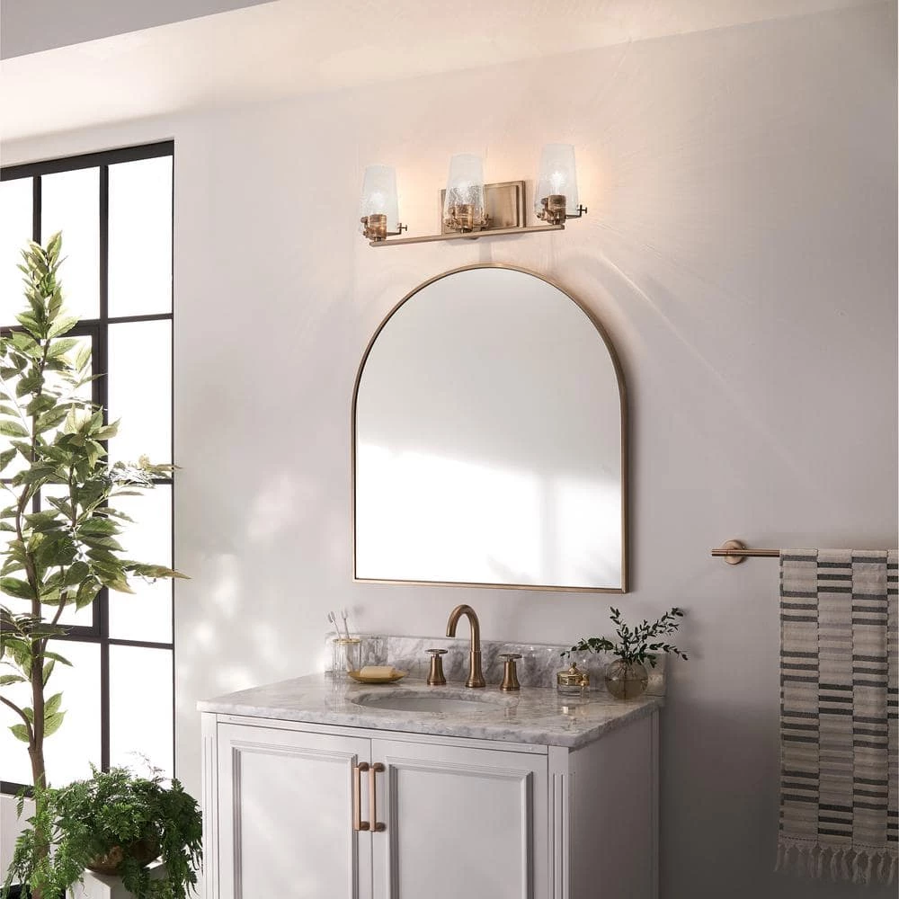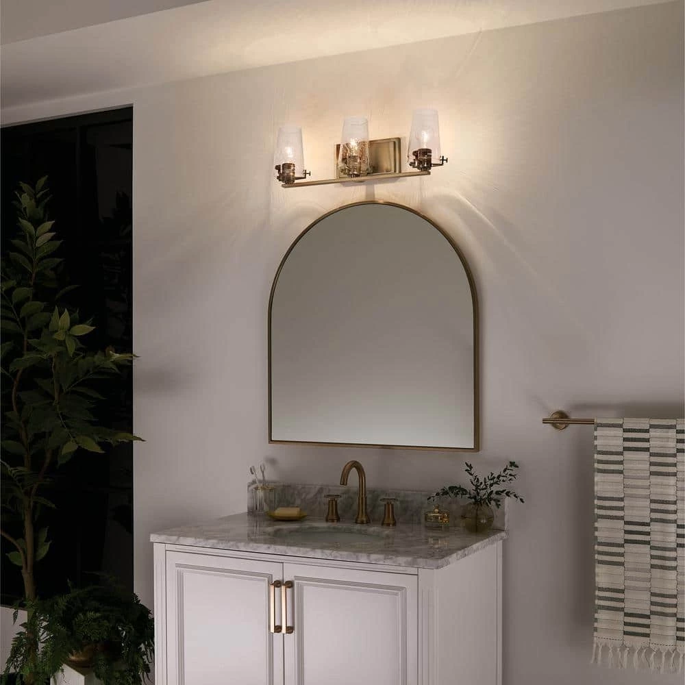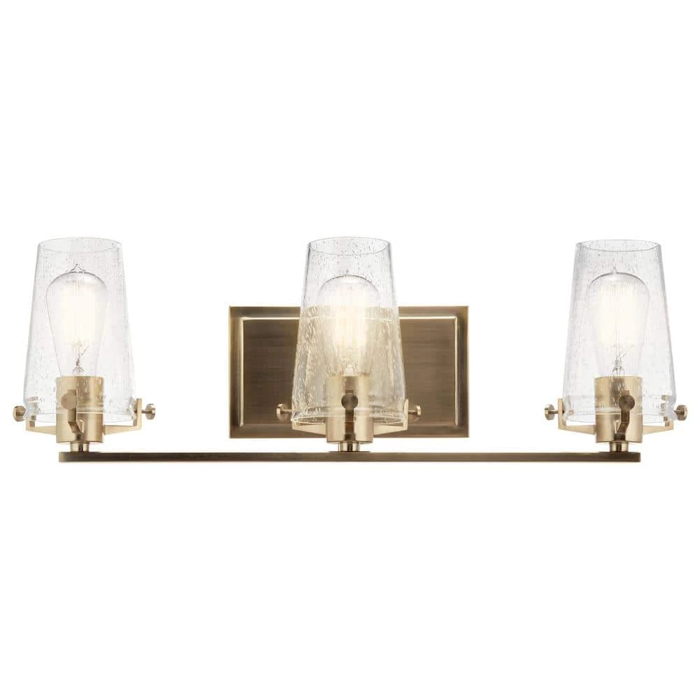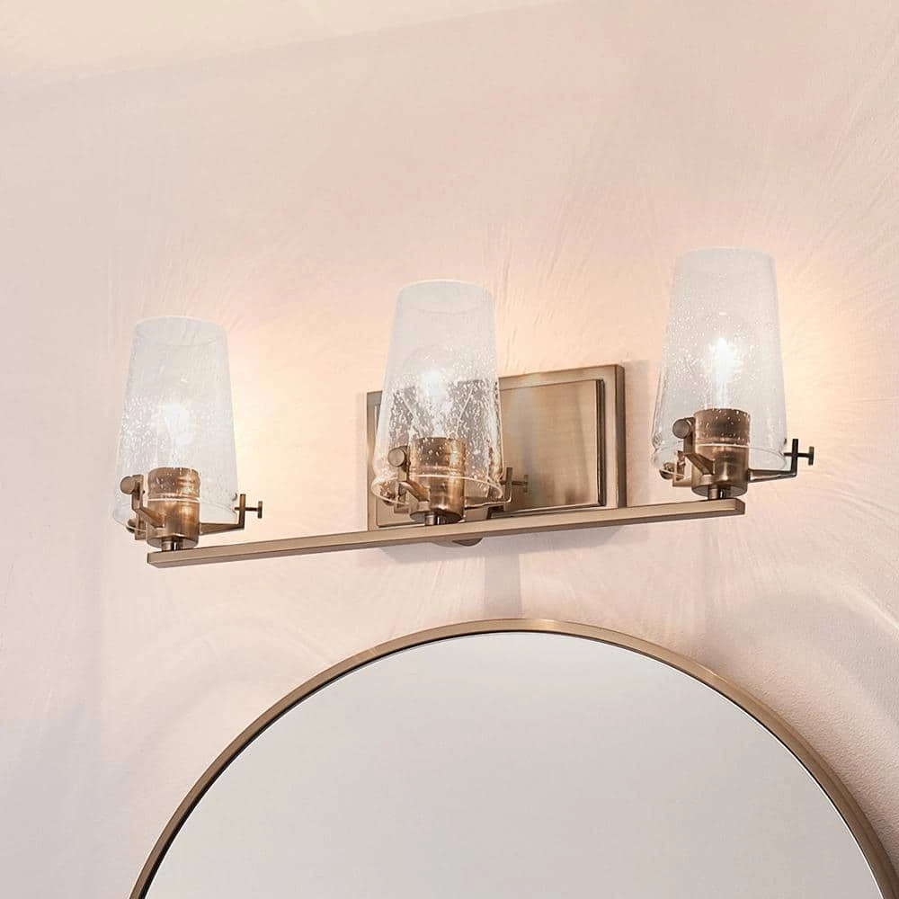 Add a touch of elegant sophistication to any room, hallway, or foyer with this tall sconce that draws approving looks and makes an impressive design statement. The Alton 3 light vanity features a classic look with its Champagne Bronze finish and clear seeded glass. This 3 light vanity makes a design statement while its decorative hardware accents create a look that is perfect in industrial, traditional or modern environments.