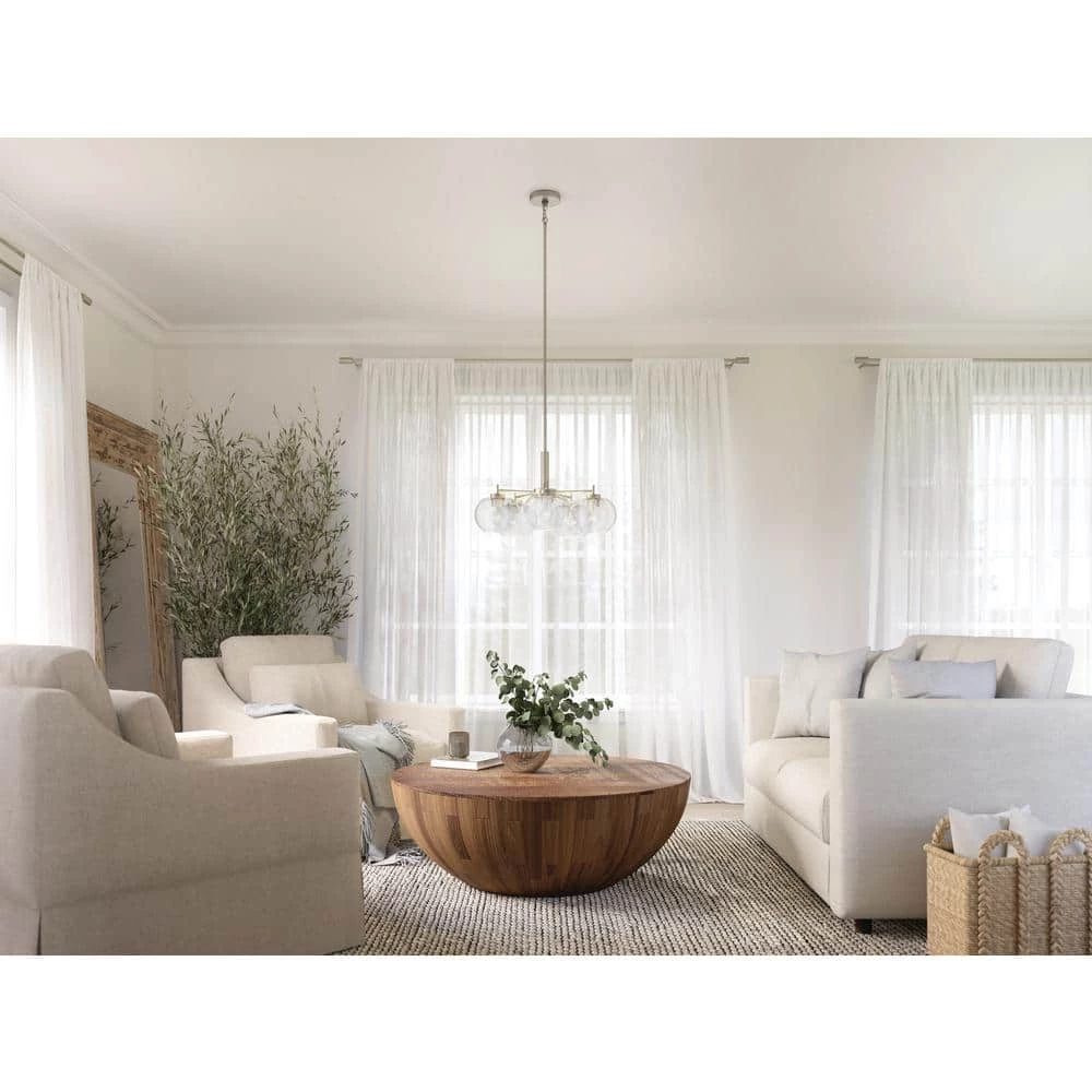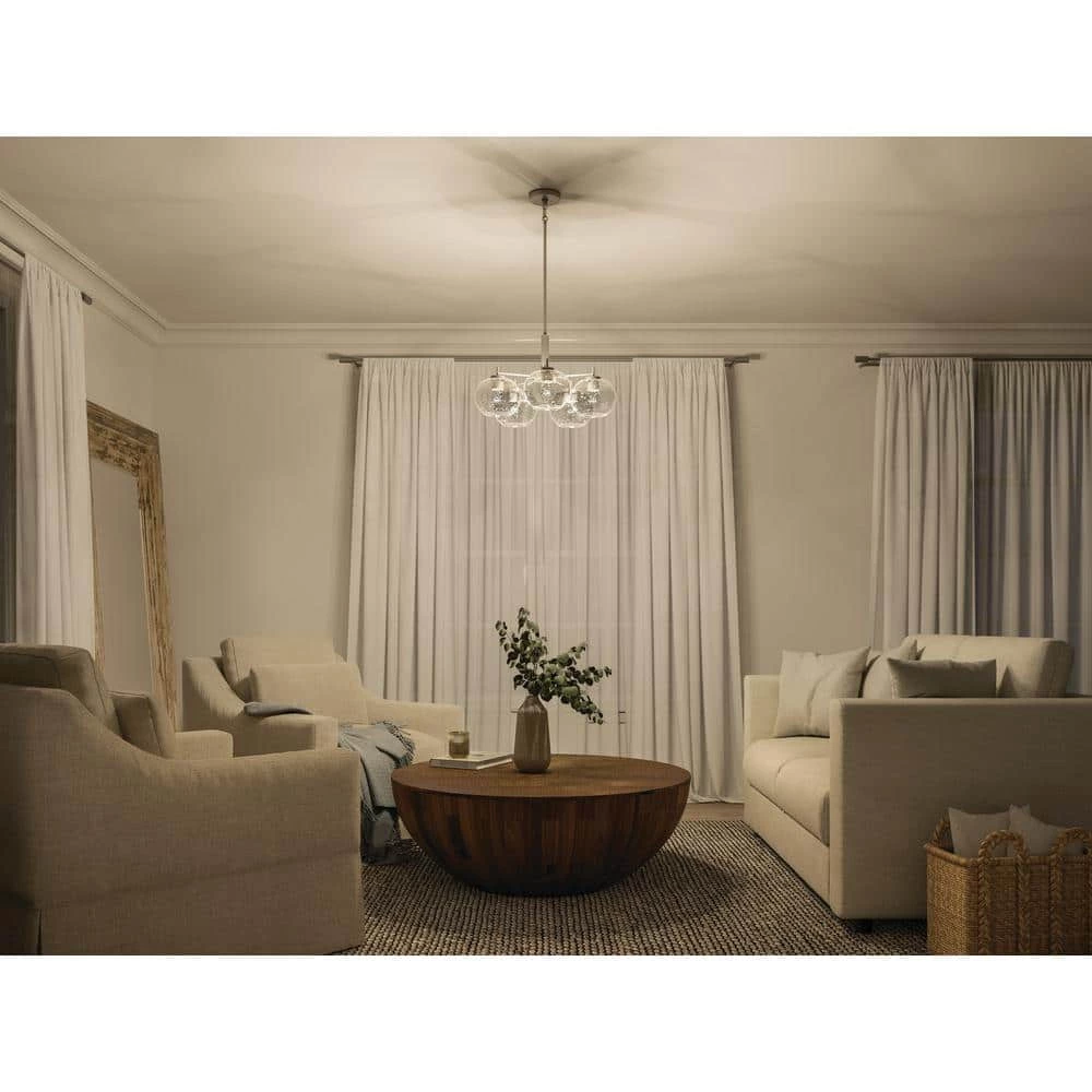 Bring originality home with this Anamaya collection, 23.5 in. 5-light chandelier in Brushed Nickel. This mod-inspired glass shape in Clear Seeded Glass is a fun option for both vintage farmhouse and transitional interiors. Hang this fixture over a dining room table for a stunning effect.
