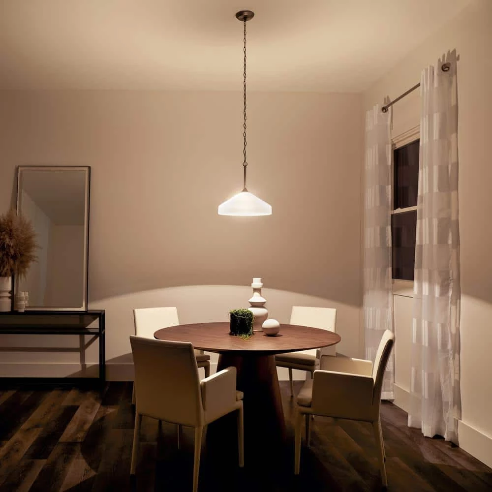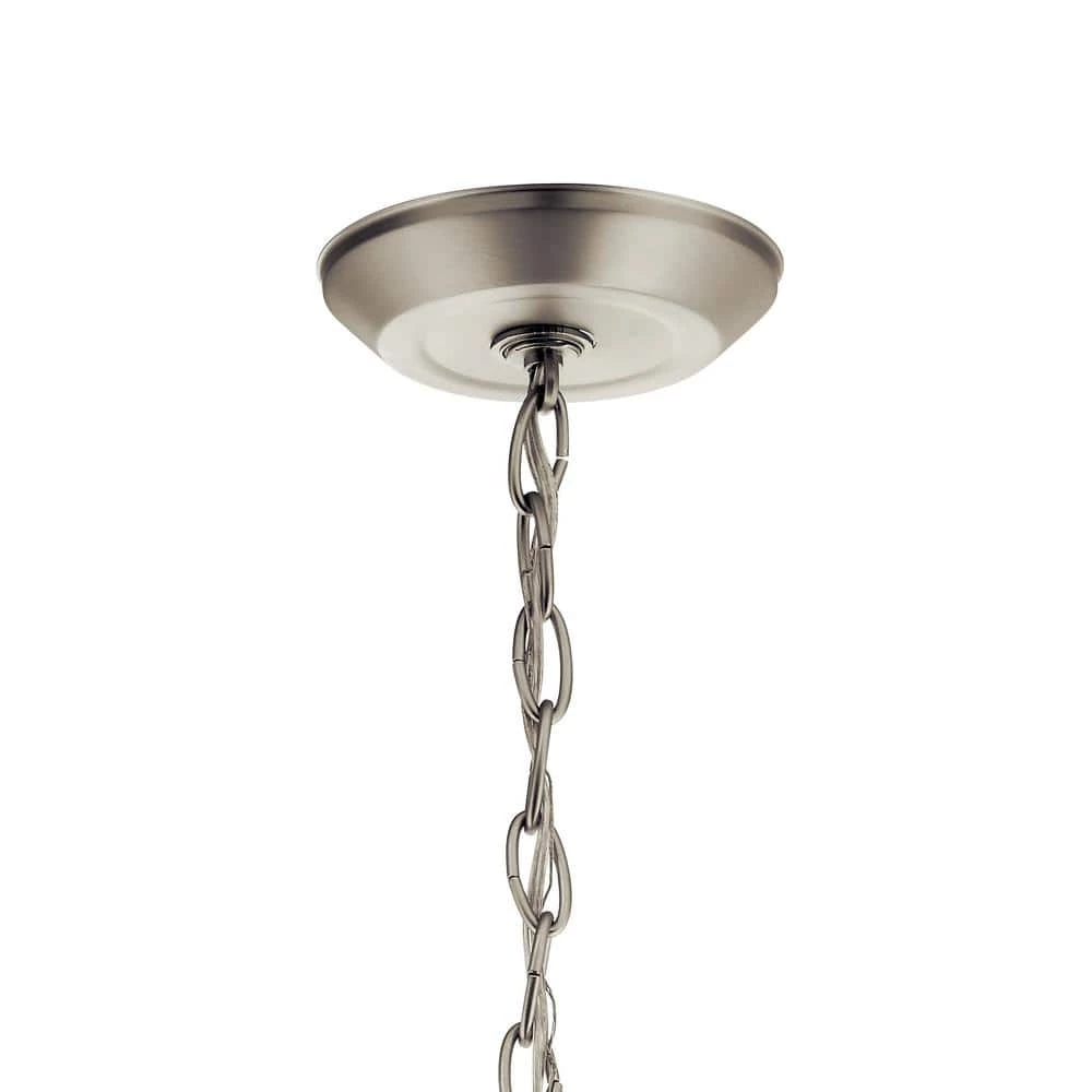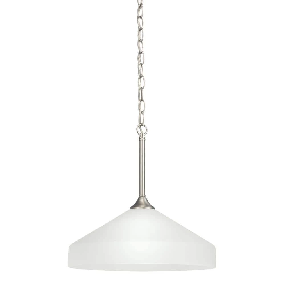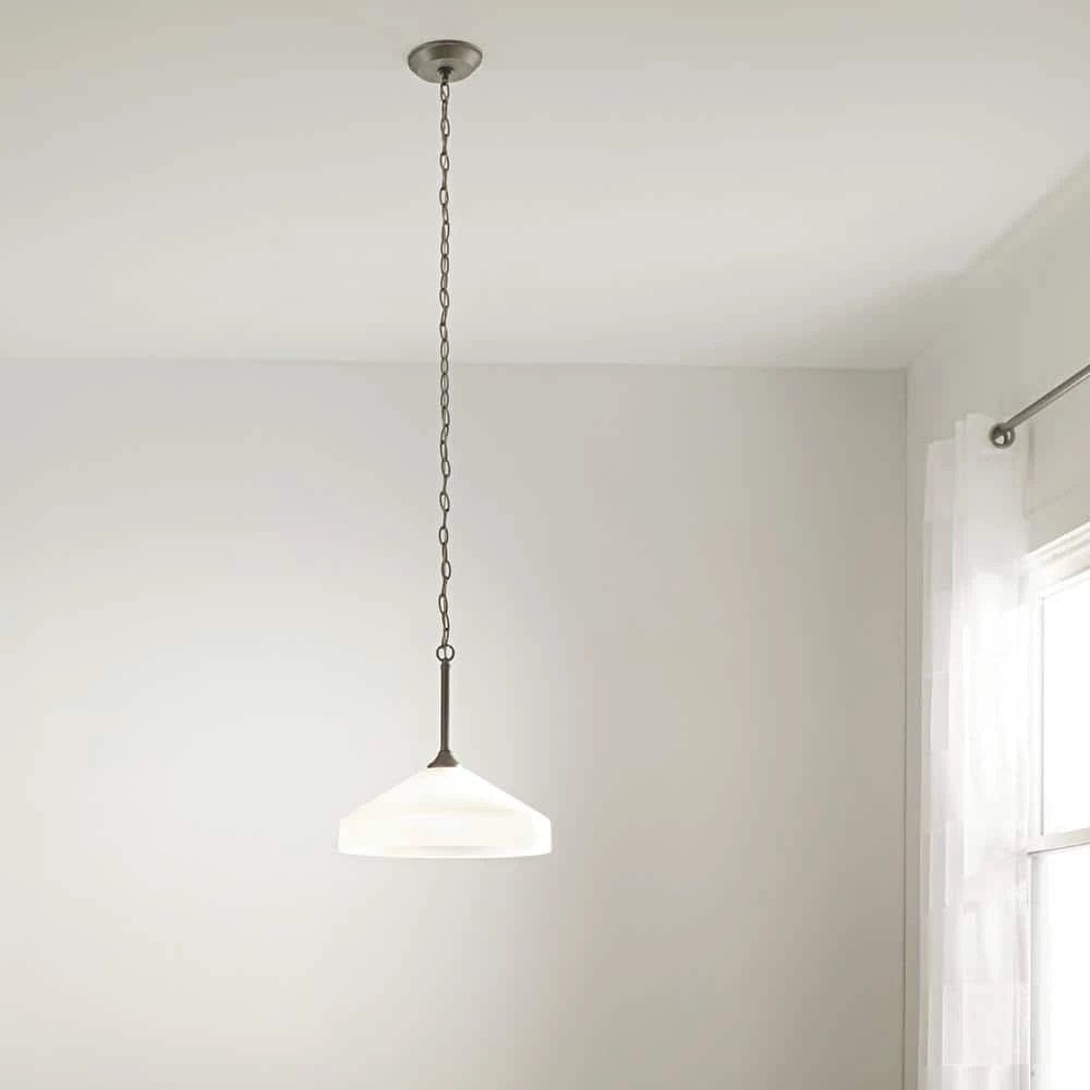 The KICHLER Ansonia 15 in. 1-Light Brushed Nickel Pendant Light has a linear design that amps up your modern space. Featuring a satin-etched glass shade, this pendant light adds a radiant glow to your living space. This pendant light from KICHLER is an ideal addition to your dining room, living room, bedroom, and more.
