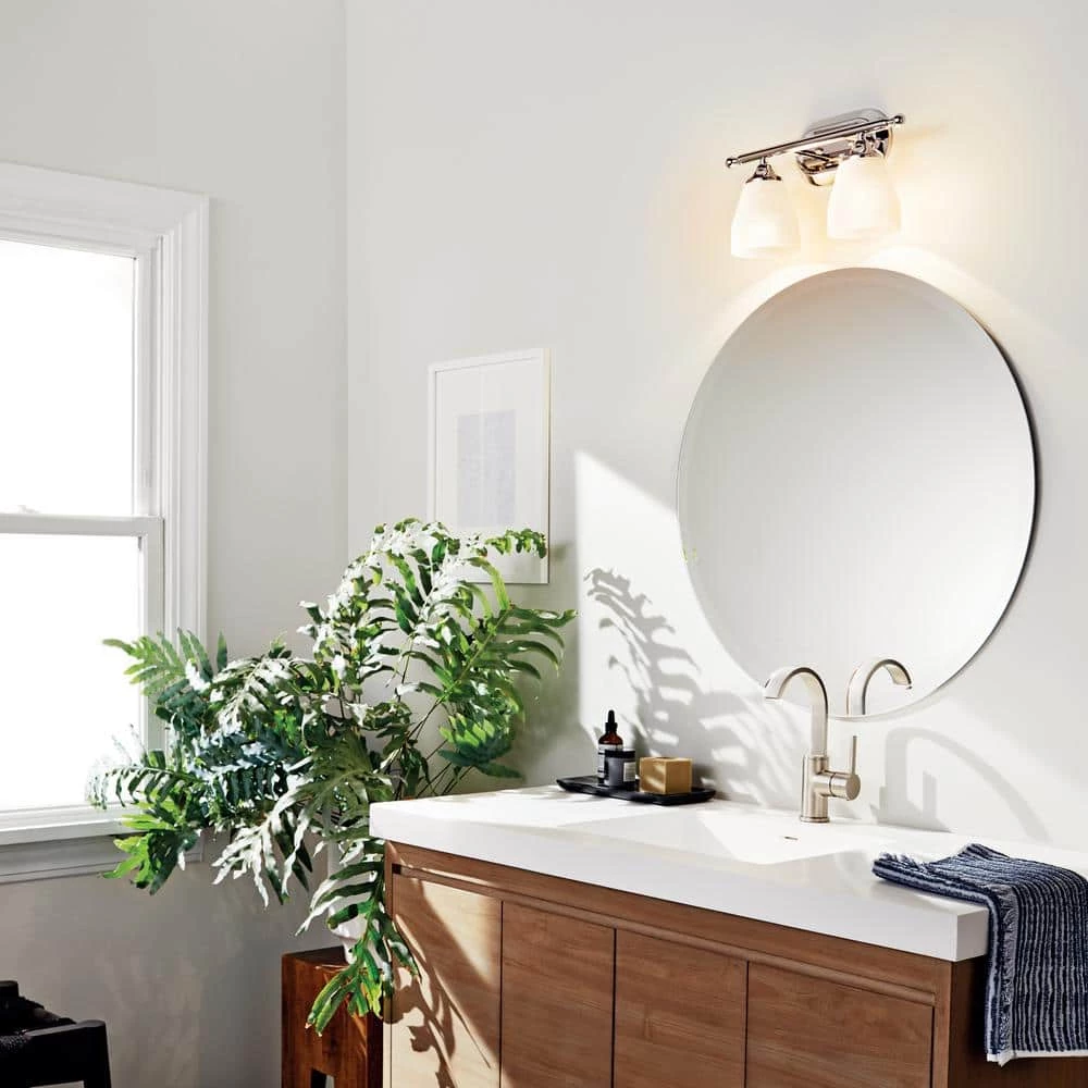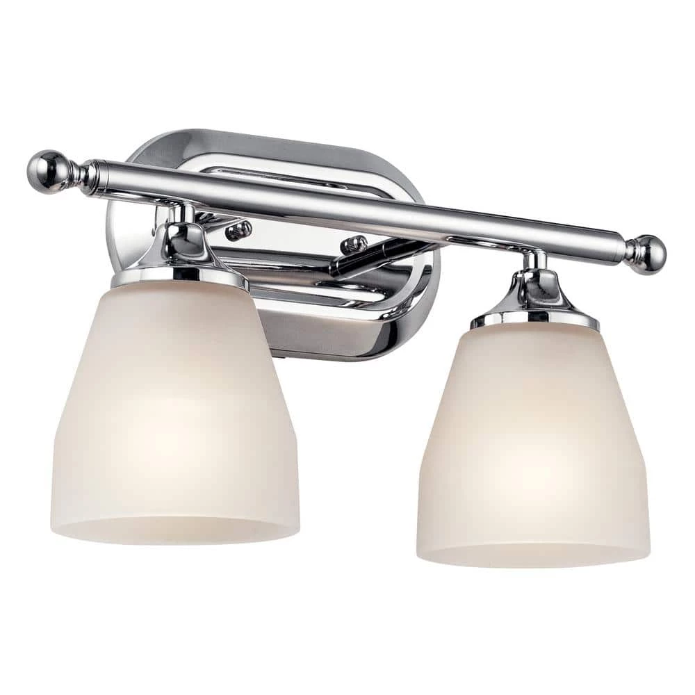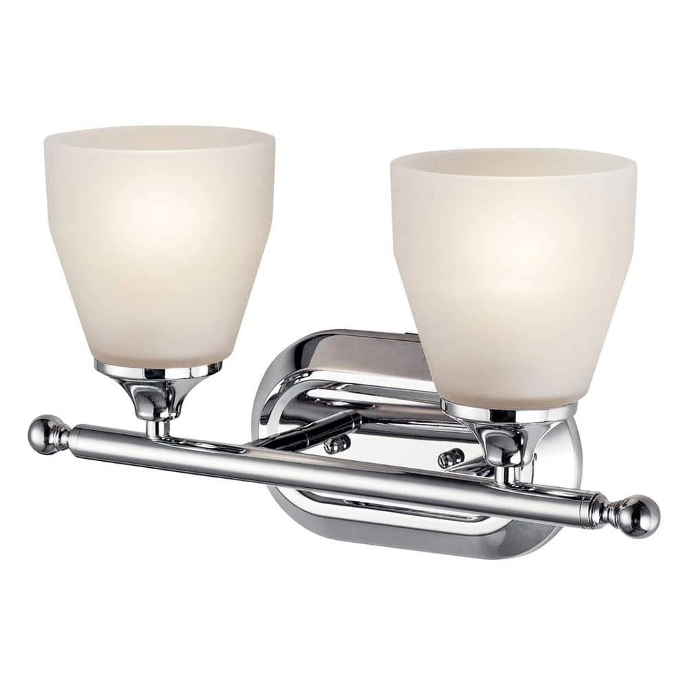 The KICHLER Ansonia 14.75 in. 2-Light Chrome Vanity Light makes for an ideal choice to light up your vanity or bath space. It features satin-etched glass shades that offer soft light diffusion. It has a sturdy backplate with an elegant chrome finish that accentuates your bath decor. This vanity light with adjustable shades allows for customized lighting. Face it up for soft ambient lighting or down to highlight the mirror.