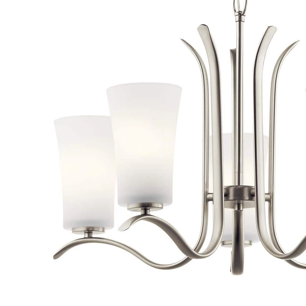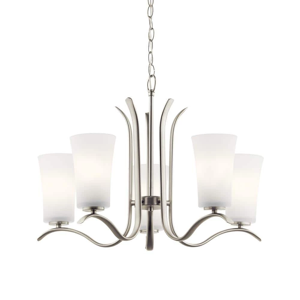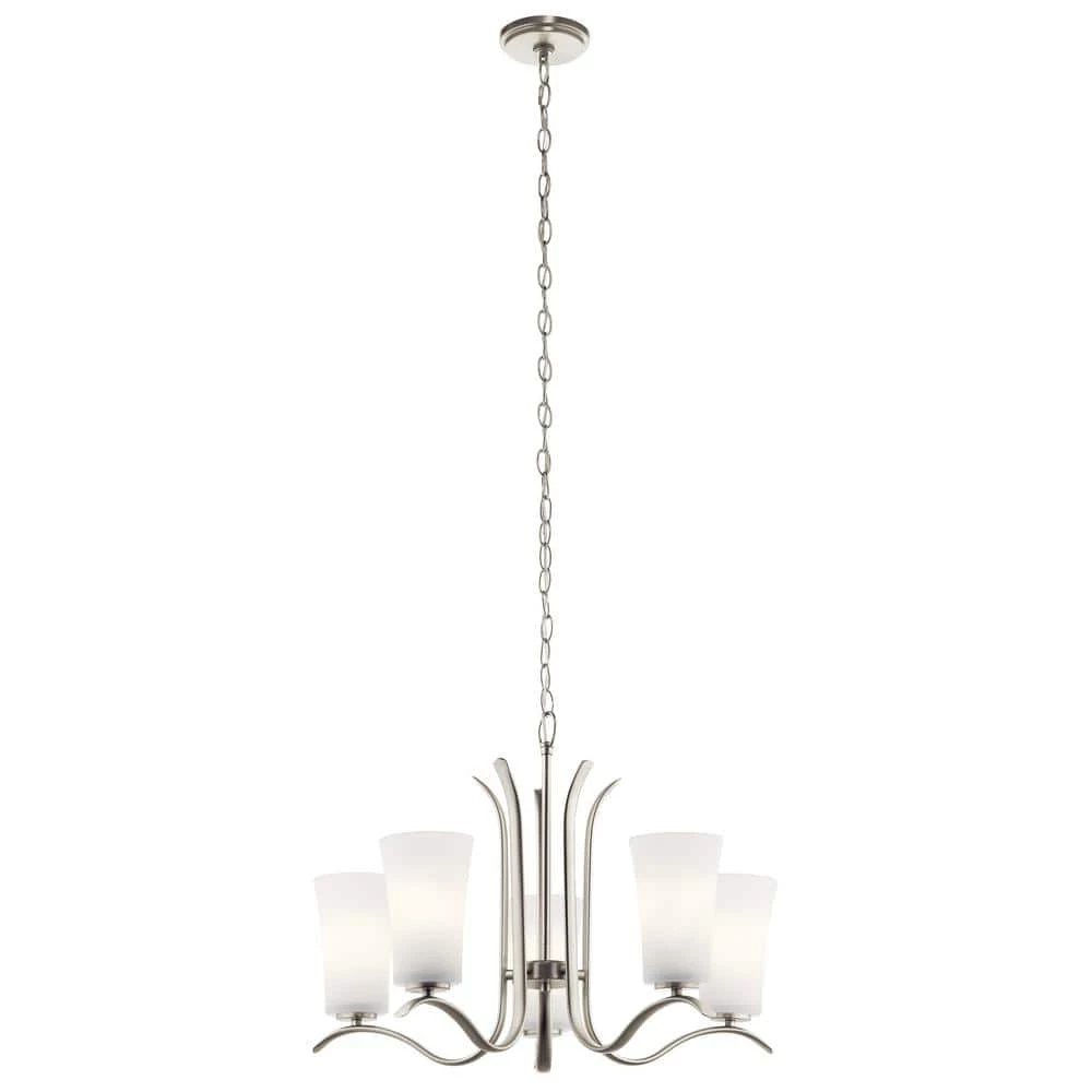 Elevate the look of your room with the Kichler Armida 18 in. 5-Light Brushed Nickel Chandelier with Satin Etched White Glass. It features clean lines and contemporary details that blend well with several decor styles. The frame of this chandelier is crafted from premium quality steel and has a brushed nickel finish for an enhanced visual appeal.