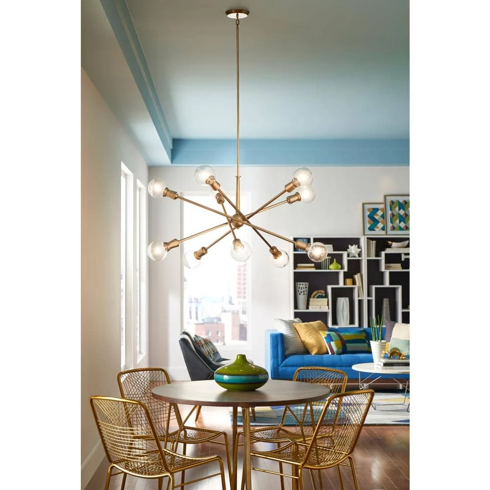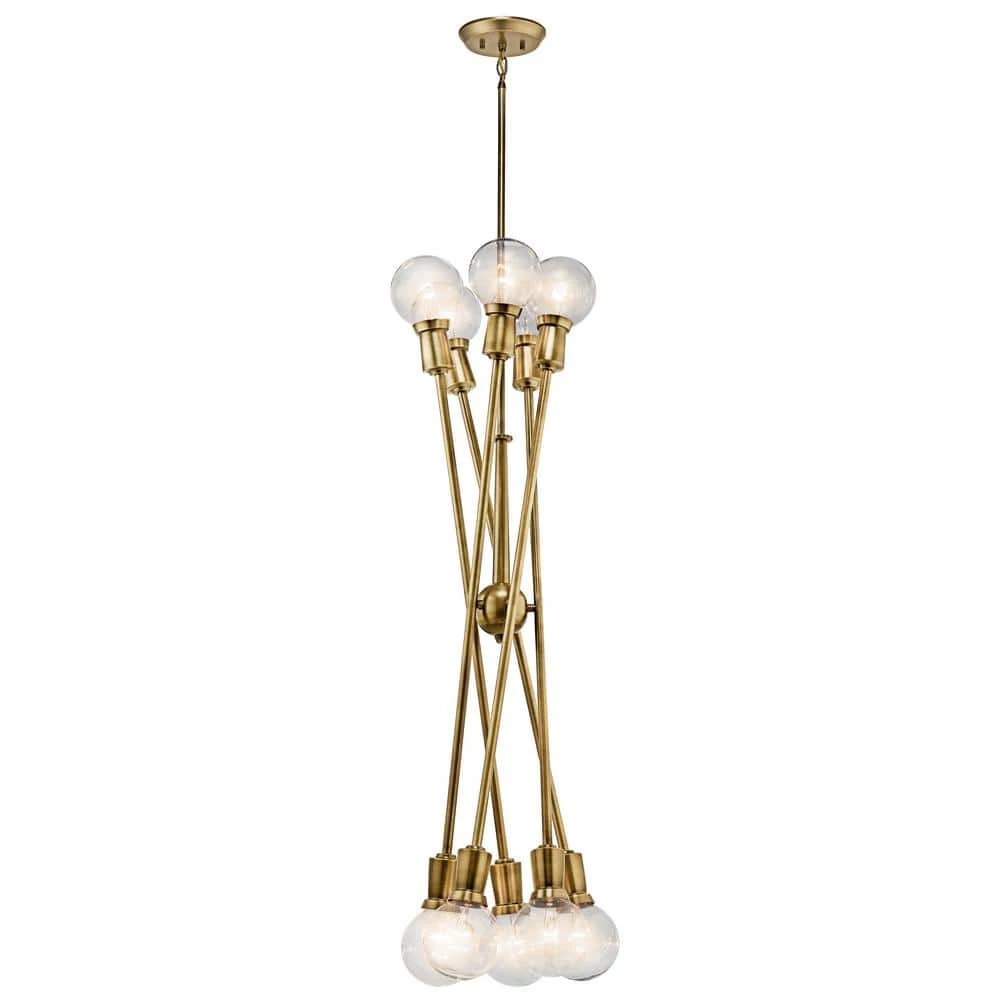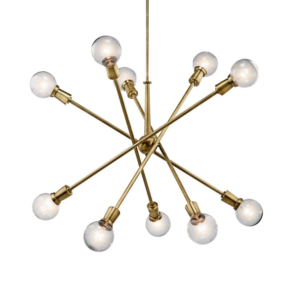 The KICHLER Armstrong 53.5 in. 10-Light Natural Brass Chandelier provides illumination in all directions, creating a pleasing display of artistic style. It features a sputnik design with adjustable arms for customized lighting effects. With its trendy look and natural brass finish, the chandelier is ideal for use in your living room or dining room.