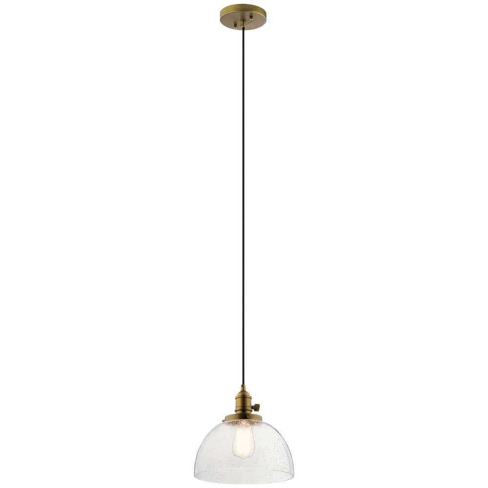 The Kichler Avery 10 in. 1-Light Natural Brass Goblet Mini Pendant Light has an industrial design to match a range of decor options. The shade is made from clear seeded glass to add a radiant glow to your space. The cord enables easy length adjustment, while the working paddle switches allow you to turn on and off the light with ease. This pendant light makes a great addition to your dining room and more.