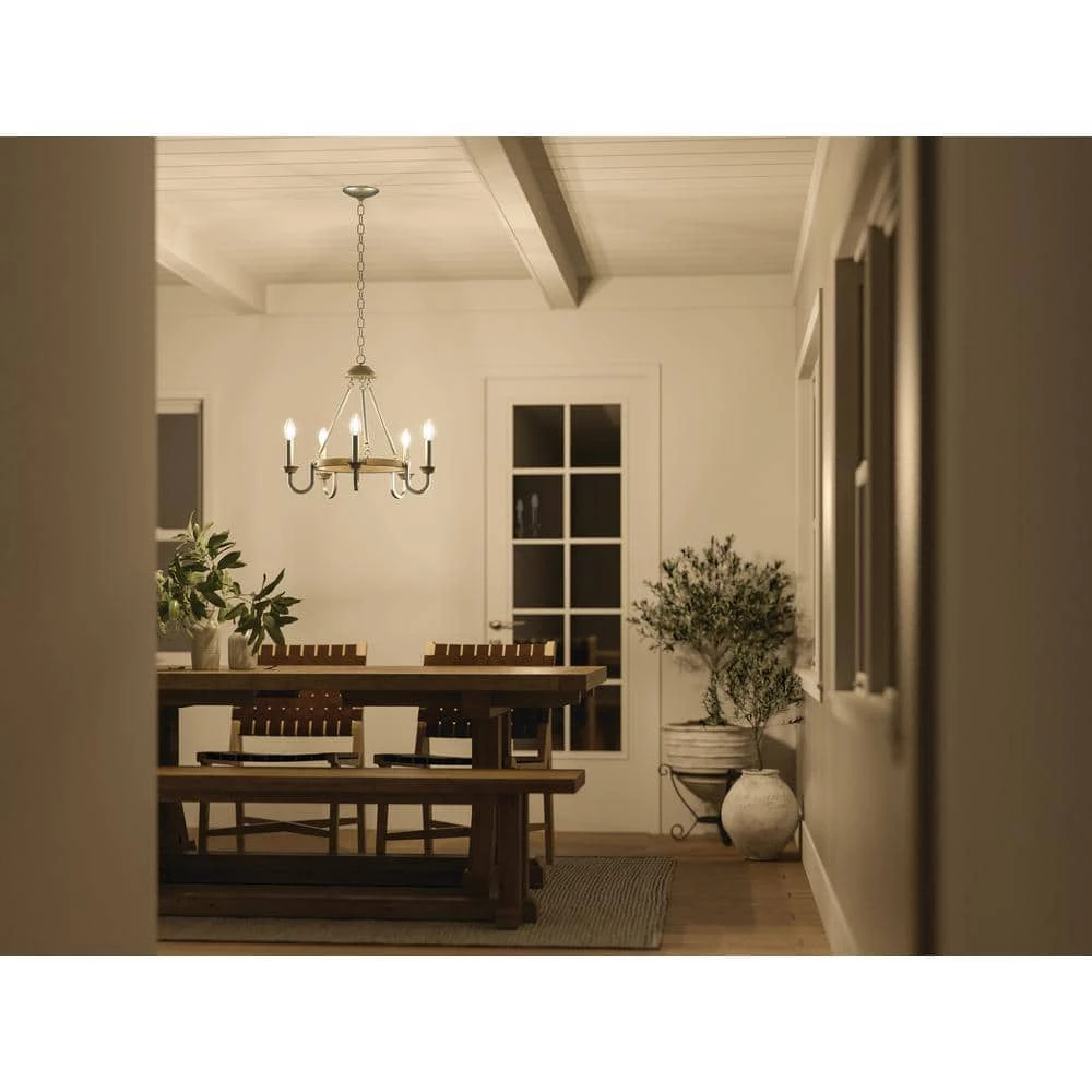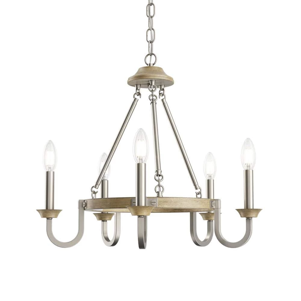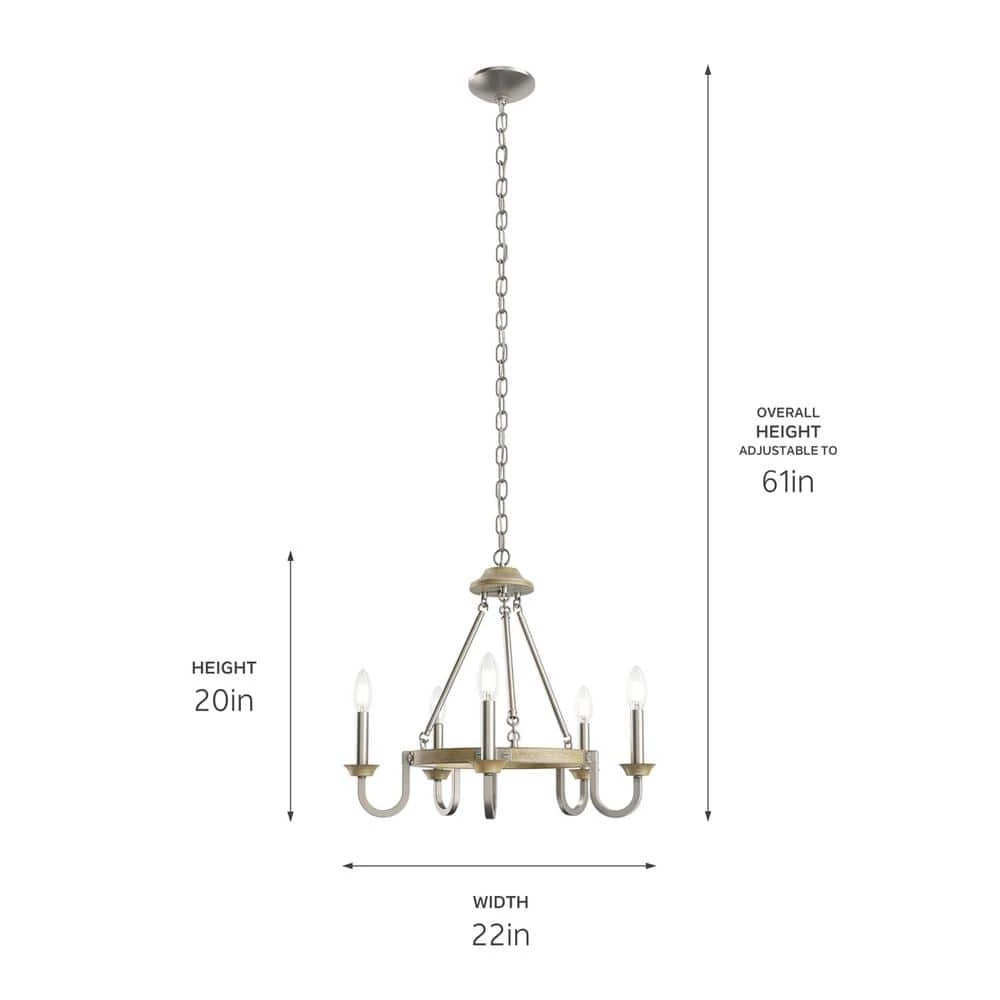 Inspired by a North Eastern Cottage style barn, the Barrett 5-light chandelier features a Distressed Antique Gray finish with Brushed Nickel accents. The rustic feel makes it ideal for modern farmhouse decor. Perfect for that spot you want an elegantly styled accent piece.