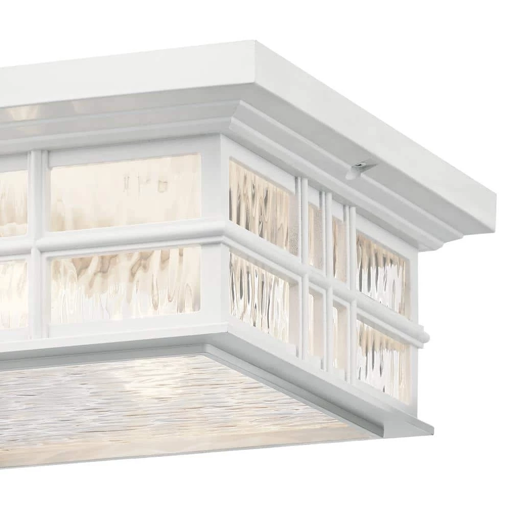The Kichler Beacon Square Climates 2-Light White Flush-Mount Light features an elegant design that draws inspiration from classic craftsman architecture. Its clear hammered glass diffuser provides bright, ambient illumination. This flush-mount light is made from EPMM that resists harsh elements such as UV rays and saltwater sprays, ensuring minimized maintenance. It is ideal for installing on outdoor ceilings.