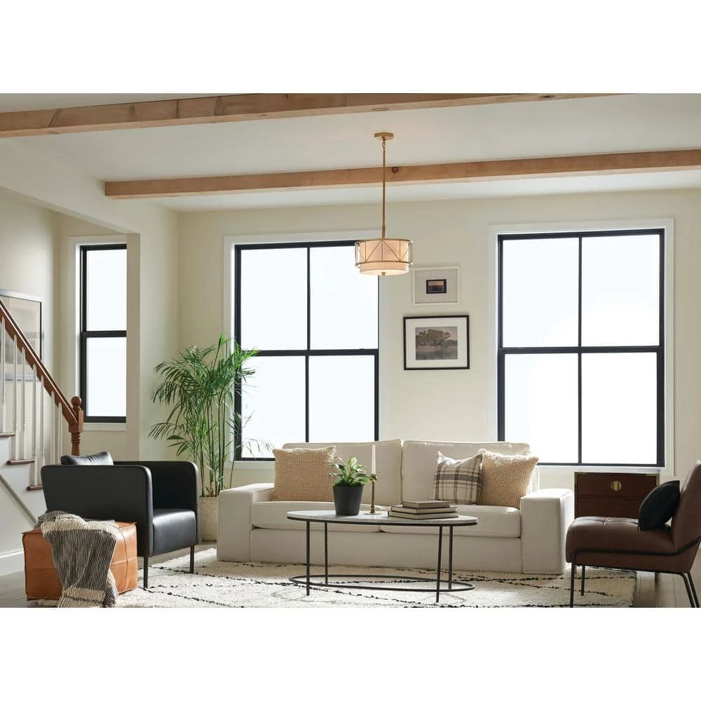 The Birkleigh 14 inch convertible pendant/semi flush with white fabric shade and satin etched glass features a simple metal geometric overlay pattern that adds dimension and visual interest with its Classic Gold finish. The satin etched glass provide a beautiful, ambient lighting to the entire room. A perfect addition in several aesthetic environments, including traditional and modern.