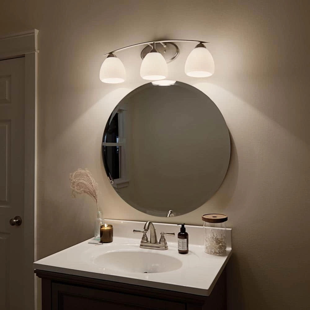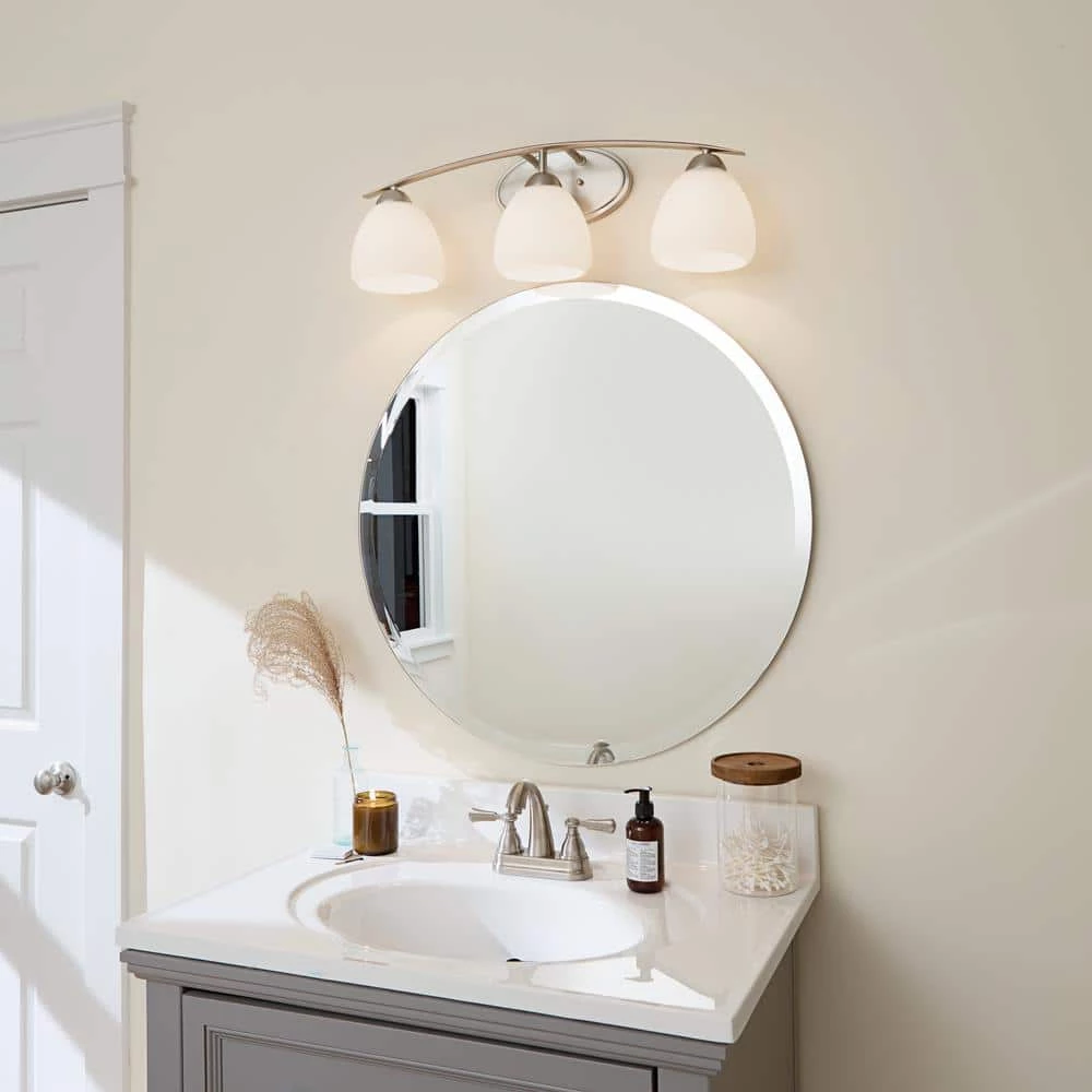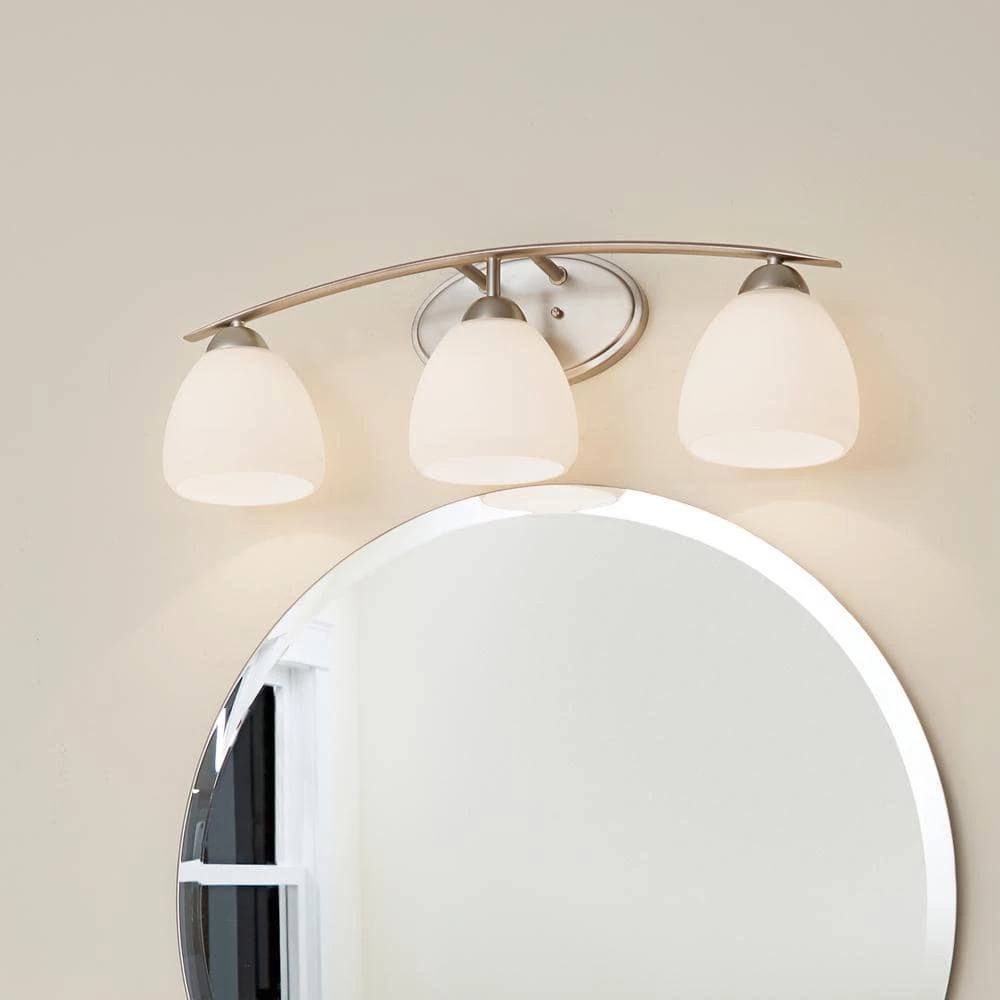 Upgrade your bathroom decor with this KICHLER Calleigh 3-Light Brushed Nickel Vanity Light. The satin etched cased opal shades diffuse a soft glow to create a comfortable and pleasant ambiance. The durable steel arm features a brushed nickel finish to lend a radiant touch to your wall. A graceful design with a bright finish makes this vanity light an ideal choice for your bathroom lighting.
