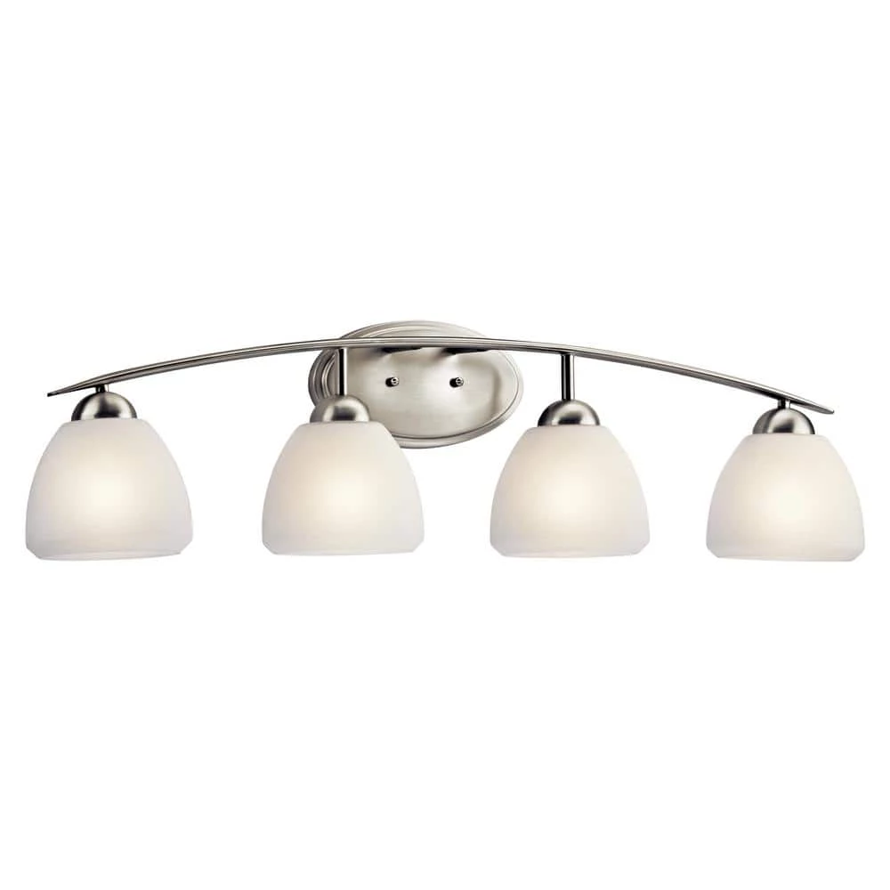 Brighten up your bath space with the KICHLER Calleigh 4-Light Brushed Nickel Vanity Light. It features 4 glass goblets that are suspended on an arched and tapered arm. This vanity light is coated with a highly durable brushed nickel finish to resist corrosion. The satin etched glass opal shades provide a warm, diffused glow to your vanity or powder room.