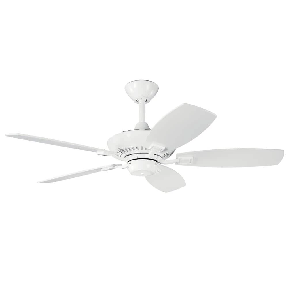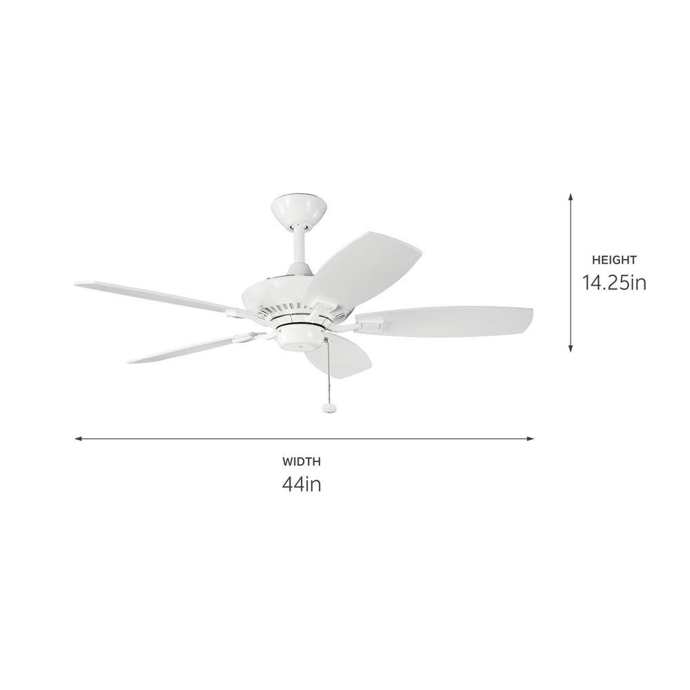 The KICHLER Canfield 44 in. 5-Blade White Fan features a powerful motor that produces optimal airflow. It comes with a pull chain for convenient speed adjustment. The fan is adaptable for low-ceiling applications and is CSA/UL listed for safe installation in damp locations.