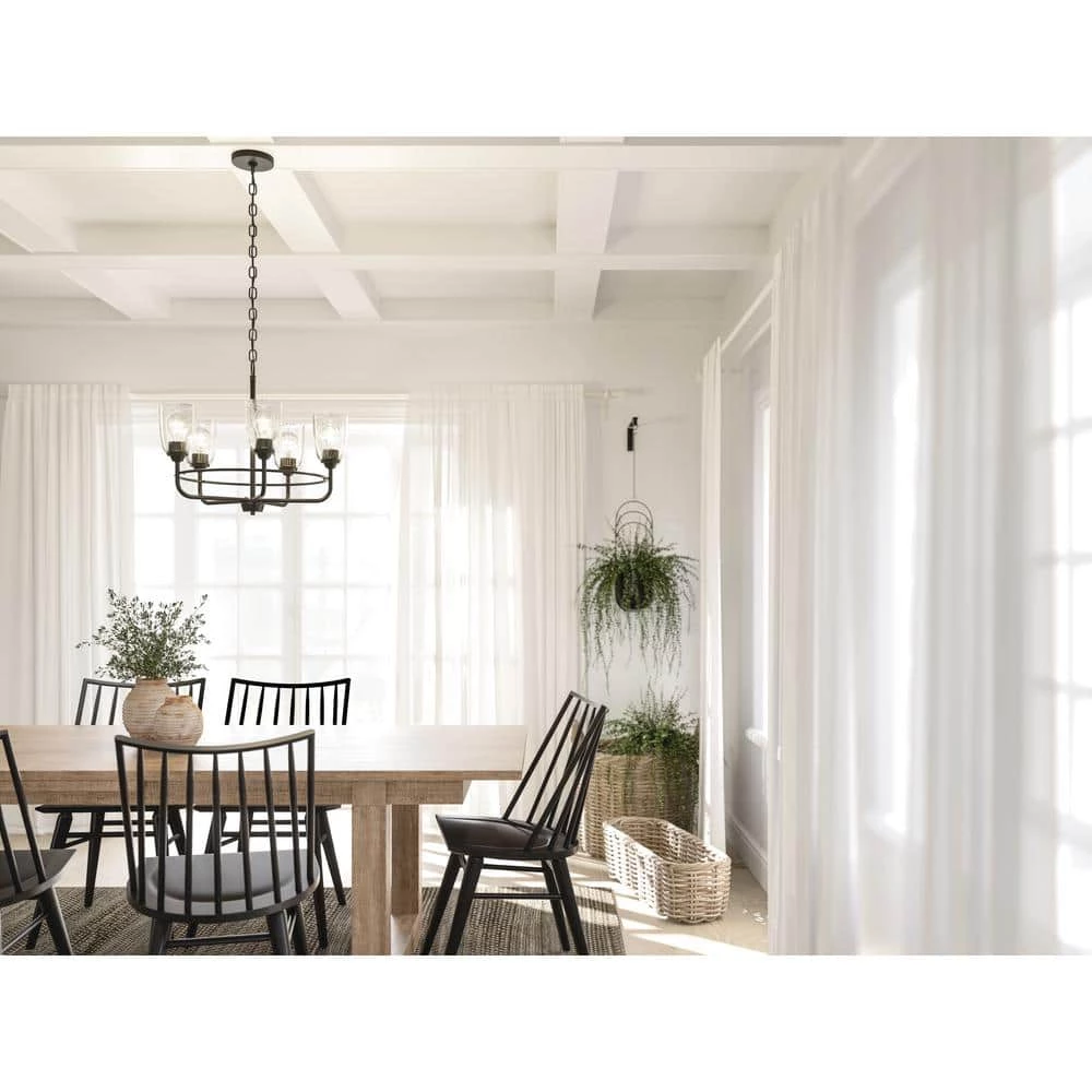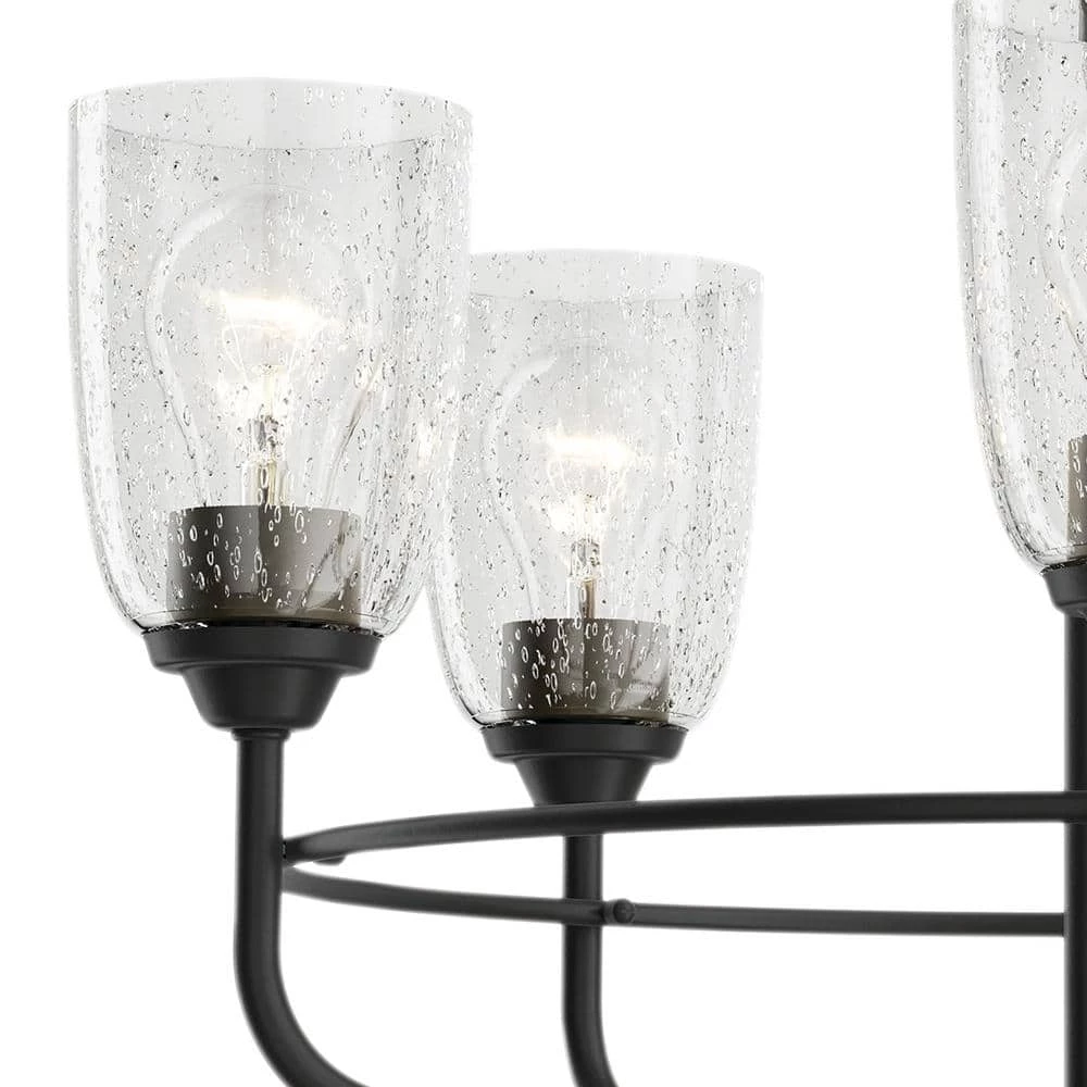 The Carlo 5-light chandelier features a Black finish and clear seeded glass while combining the popular wagon-wheel with a classic 5-arm chandelier design. Ideal for transitional environments, the Carlo chandelier is stunning over a dining room table or in a taller entryway.