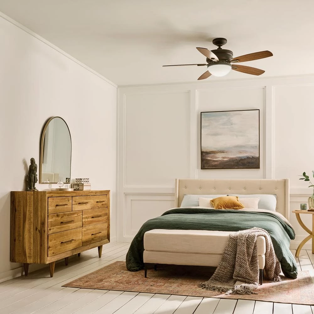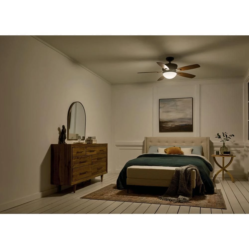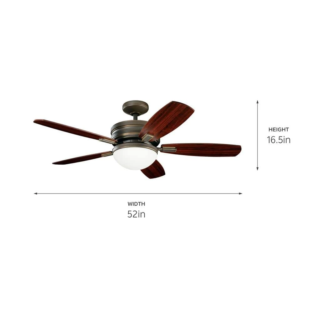 The KICHLER Carlson 52 in. Oiled Bronze LED Fan features reversible blades that allow for versatile styling to complement your decor. It comes with three speed settings that offer precise airflow control. The fan also includes an LED light with an etched opal glass diffuser for soft illumination. This fan makes for an ideal choice to install in your bedroom, living room, office and more.