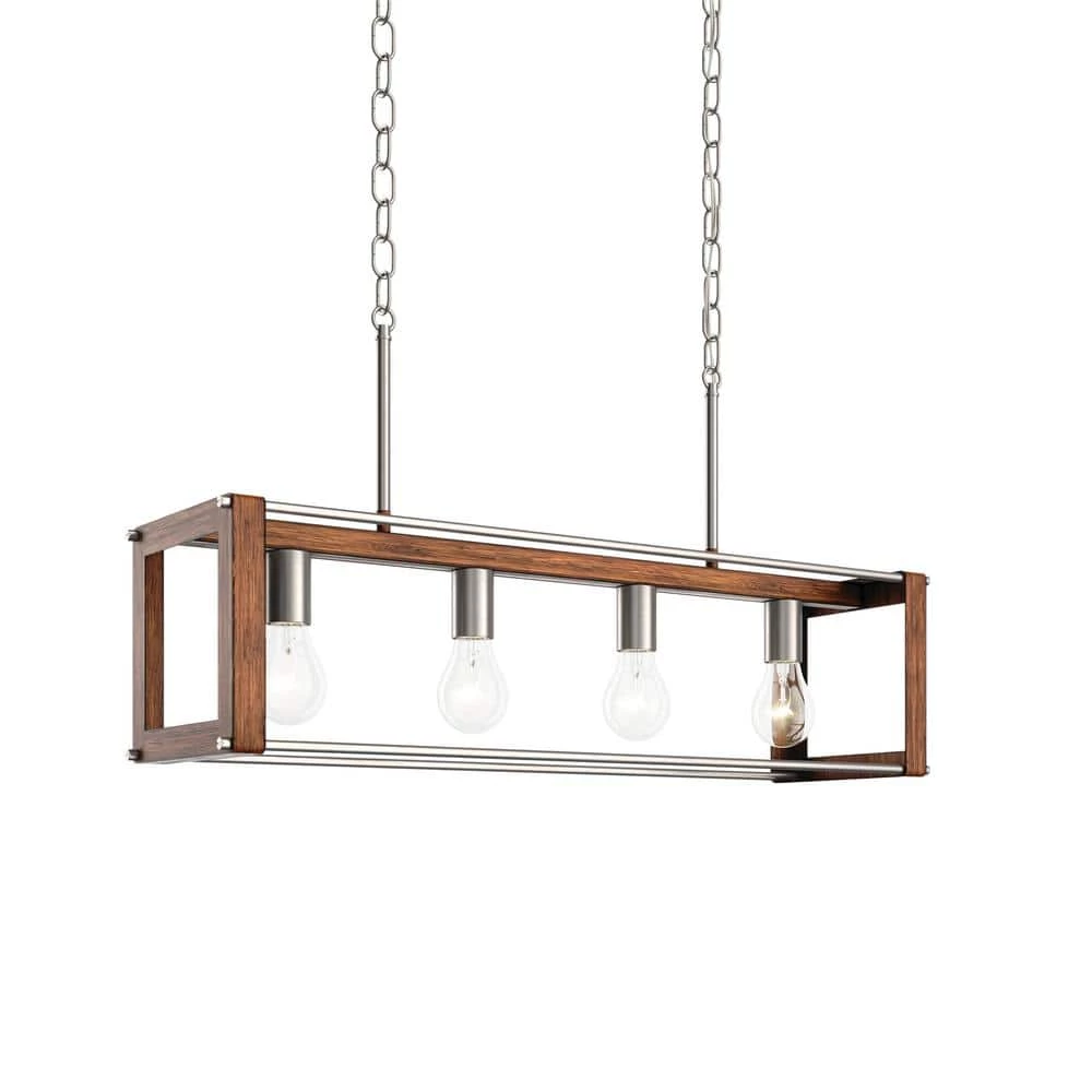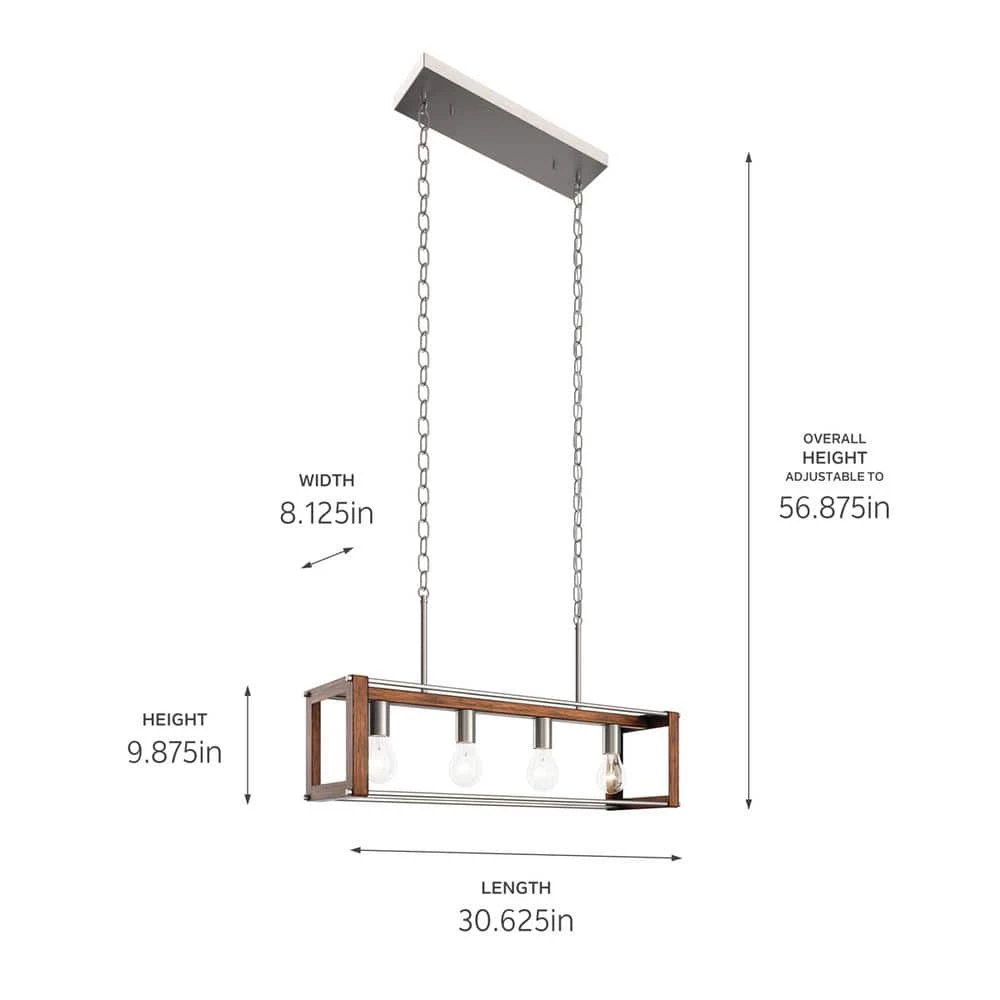 The Chatwin 4-light linear chandelier features a Brushed Nickel finish with Auburn Stained accents. This piece is suitable for transitional environments yet versatile to complement farmhouse or updated traditional decor. Perfect for that spot you want an elegantly styled accent piece.