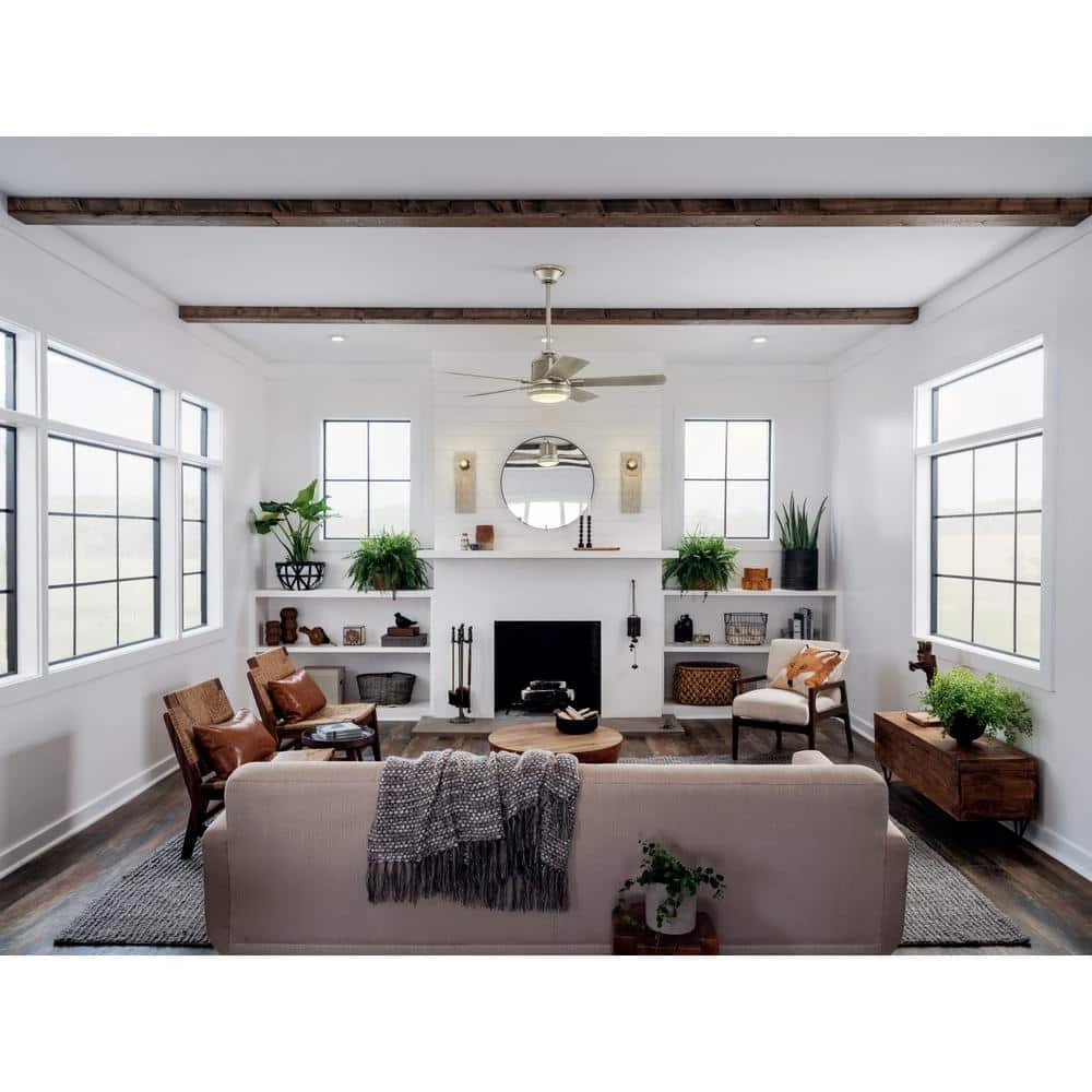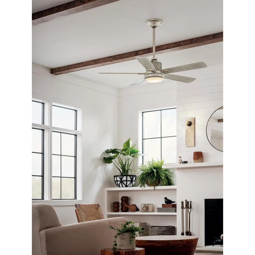 The KICHLER Colerne 52 in. 5-Blade Brushed Nickel LED Fan features an industrial design that complements various types of decor. It has a five-blade configuration along with a powerful motor for efficient cooling. This KICHLER ceiling fan comes with an integrated LED downlight that provides an ambient glow for optimum illumination.