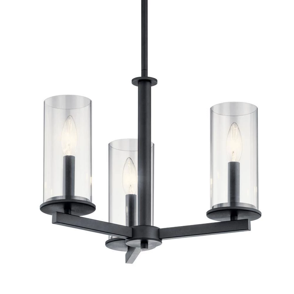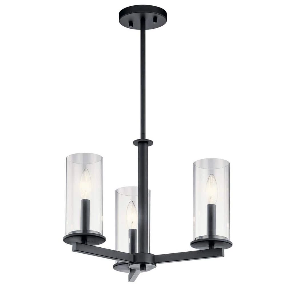 The KICHLER Crosby 13.75 in. 3-Light Black Convertible Chandelier features a design that can be transformed into either a semi-flush light or a mini chandelier. It has clear glass diffusers that provide bright illumination to add beautiful, ambient lighting to your space. The chandelier’s Black finish accentuates any contemporary-style decor. This exquisite fixture from KICHLER is sure to accentuate the decor of your living room or dining space.