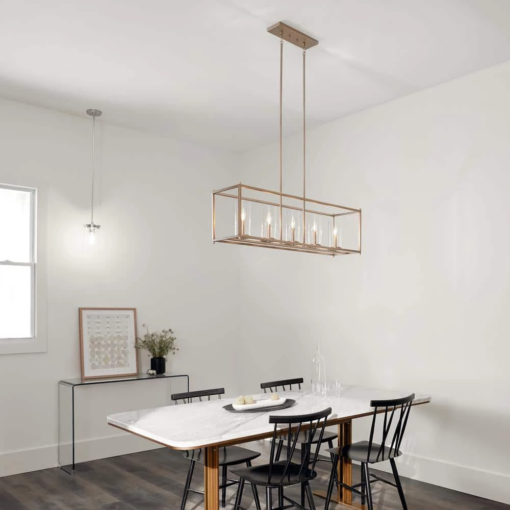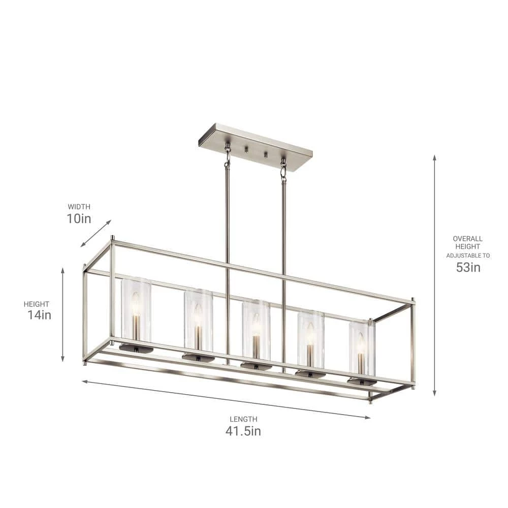 At Kichler we focus on innovation, technology, product performance, safety, and certification; we never stop identifying new ways to improve our products and services. We are committed to creating products that are crafted from the highest quality steel, glass, and integrated fasteners to deliver a fixture that is both beautiful and easy to install. We pride ourselves on rigorous in-house testing to ensure that our products meet the highest of industry standards and that our customer service team is here for you to help answer questions or guide you as you tackle a new lighting project. All these factors come together to ensure we’re continuously working to create a better and more effective way to help people see what matters most. The KICHLER Crosby 13.75 in. 5-Light Brushed Nickel Linear Chandelier comes with clear glass diffusers that provide bright illumination. This distinctive chandelier features a brushed nickel finish that is sure to blend well with most types of decors. The steel construction makes it highly durable and easy to maintain. This minimalistic yet classy fixture is sure to accentuate your decor.