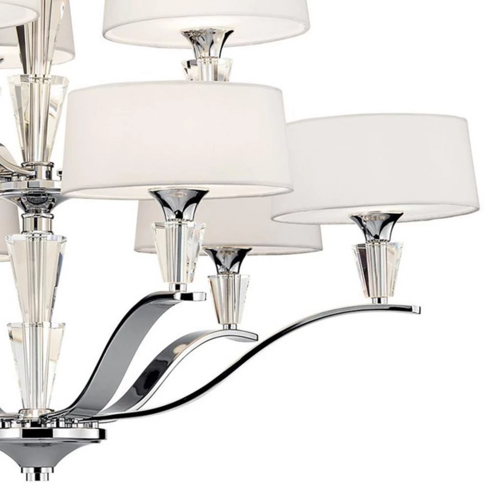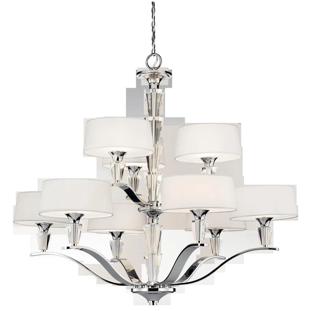 The KICHLER Crystal Persuasion 9-Light Chrome Chandelier features a striking design to accent your room decor. The white linen fabric shades and satin etched glass diffusers provide a soft glow to light up your space. Crafted of steel, this chandelier is durable and ensures lasting use. This chandelier from KICHLER is ideal for illuminating your dining room, living room, bedroom and more.