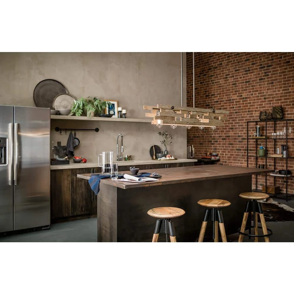 The KICHLER Cuyahoga Mill 43.75 in. 5-Light Anvil Iron Linear Chandelier features adjustable shades made of reclaimed wood planks for versatile styling options. It has a unique iron finish that adds contemporary elegance to your decor. The chandelier’s durable steel construction ensures long service life and minimized maintenance.