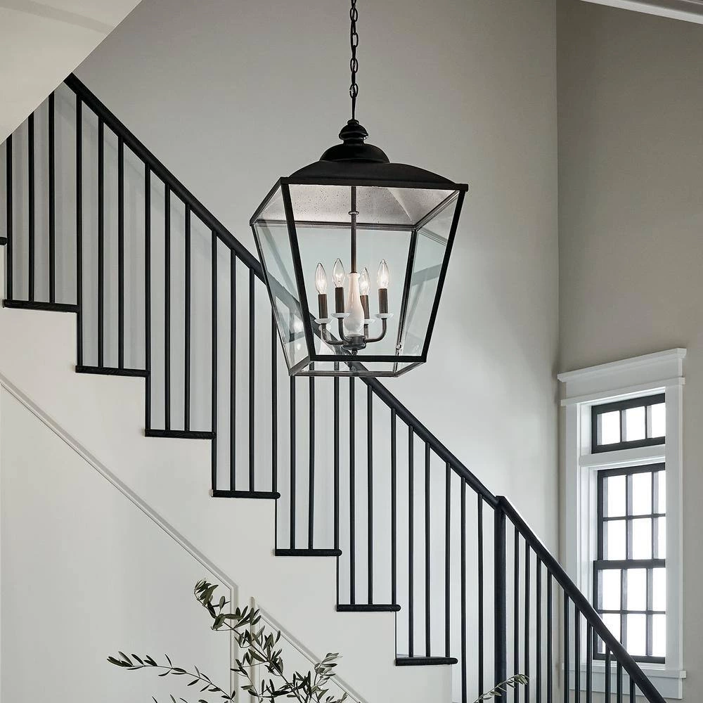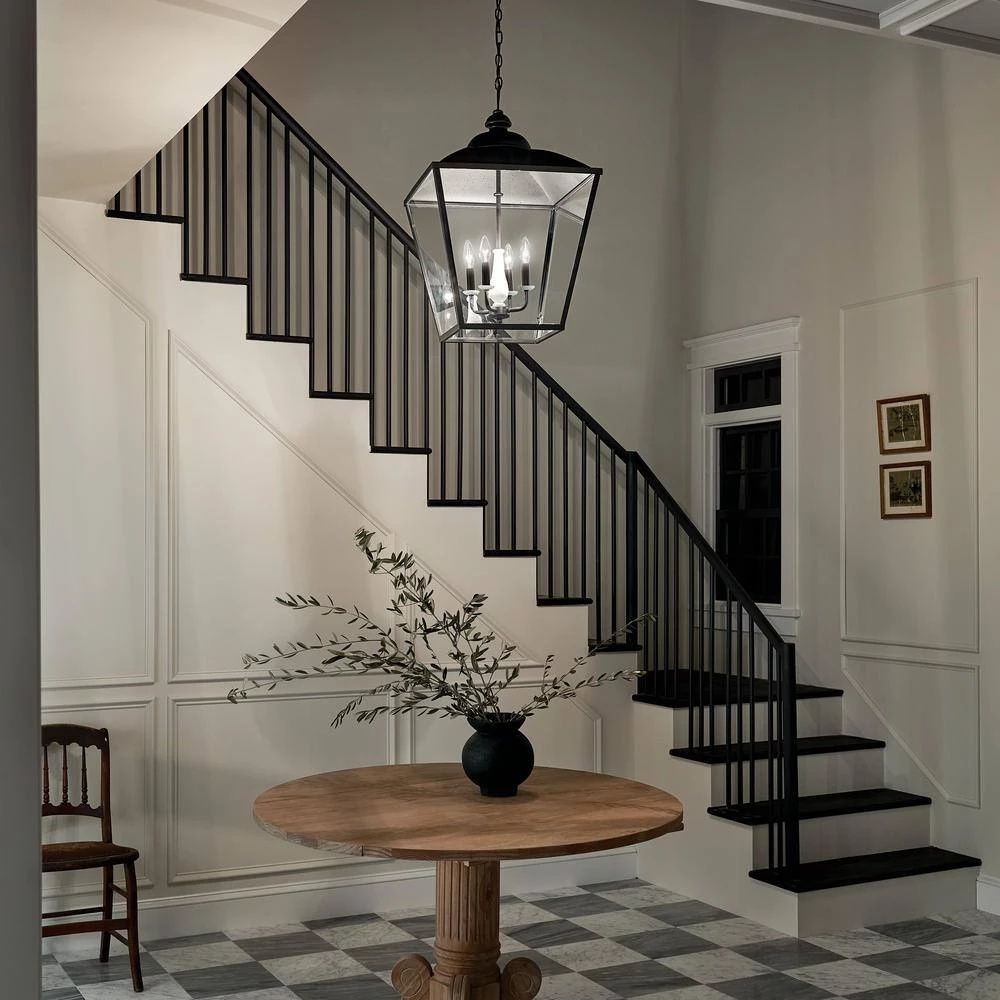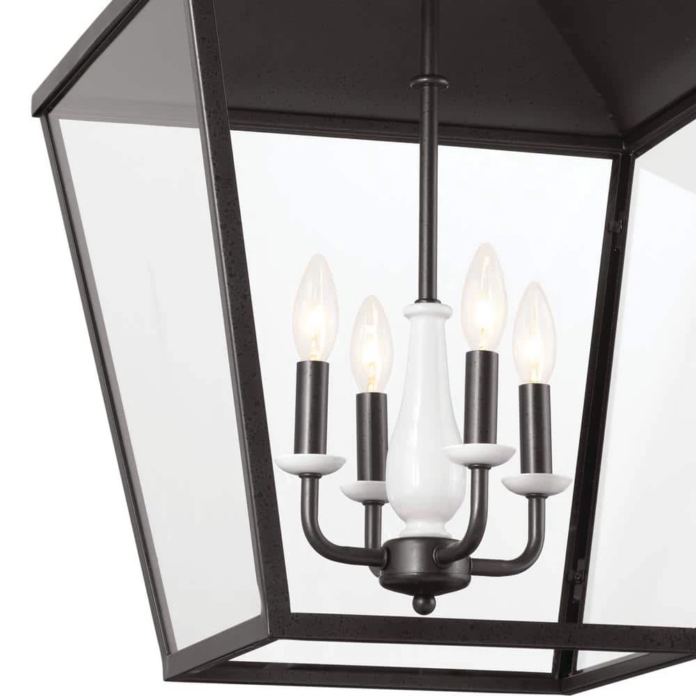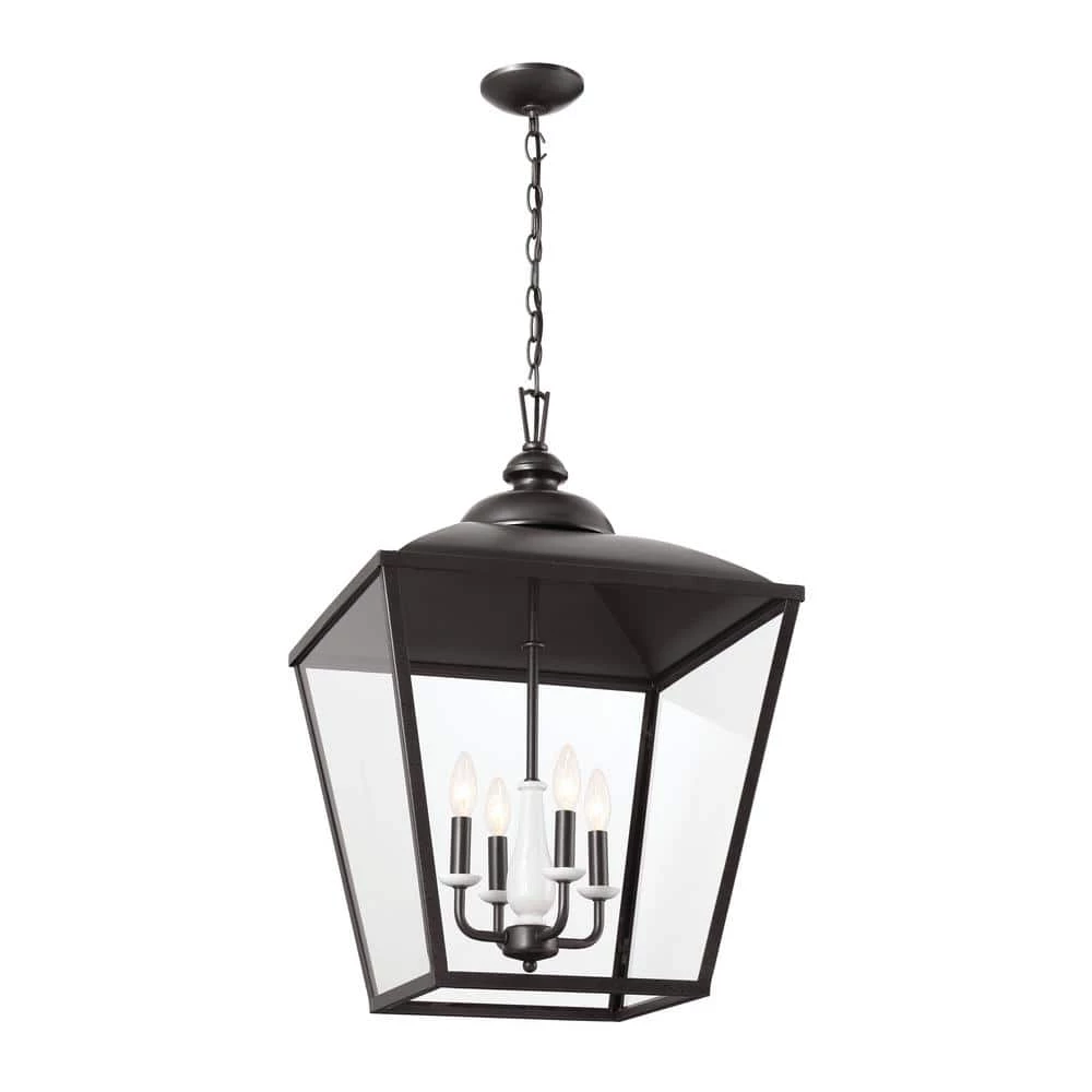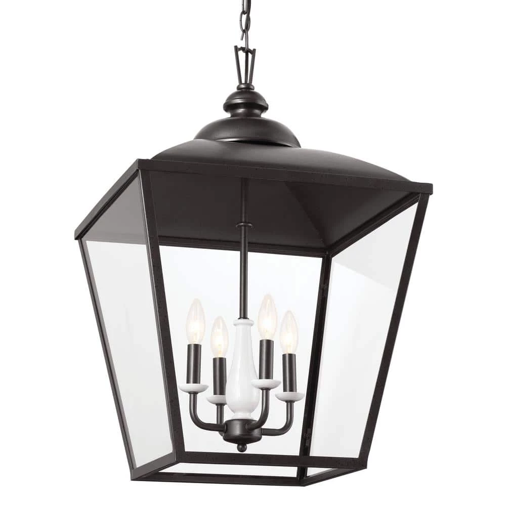 Elegant and romantic, the Dame collection refreshes the traditional lantern. with its divine details, refined finishes and vintage flair, Dame is both sophisticated and charming. The Dame 4 light foyer pendant refreshes the traditional lantern. Its oversized Anvil Iron hood, elegant White accents and candles lit through Clear Glass panes infuse old-world charm into your space.