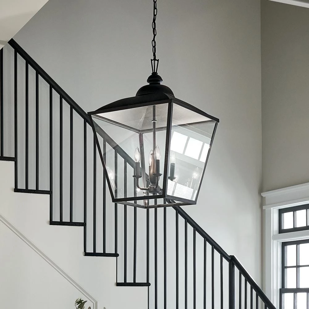 Elegant and romantic, the Dame collection refreshes the traditional lantern. with its divine details, refined finishes and vintage flair, Dame is both sophisticated and charming. The Dame 4 light foyer pendant refreshes the traditional lantern. Its oversized Textured Black hood, elegant details and candlestick lights through Clear Glass panes infuse old-world charm into your space.