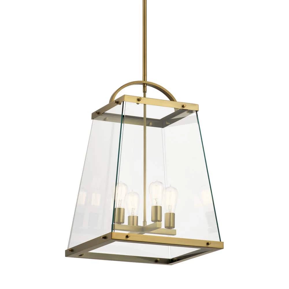 The KICHLER Darton 25.75 in. 4-Light Brushed Natural Brass Large Foyer Pendant Light features a minimalistic design to match a wide range of decor options. The clear glass shade provides bright, even illumination to your space. This light from KICHLER has a durable steel construction to ensure long-term, worry-free use.