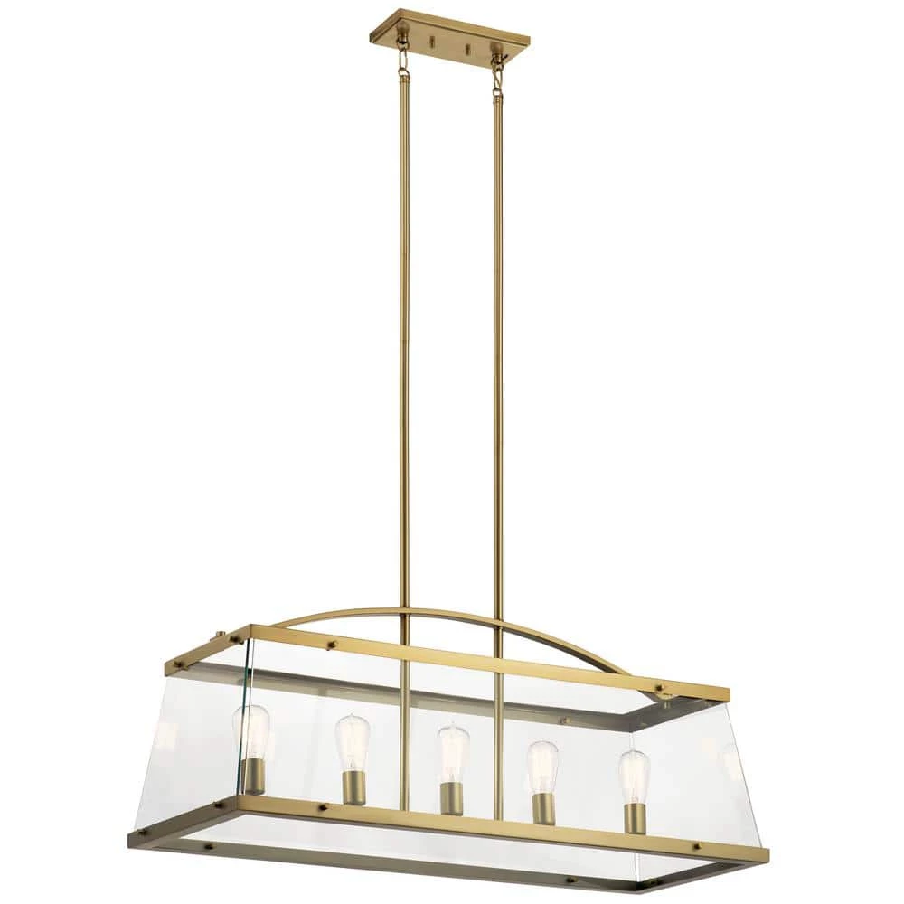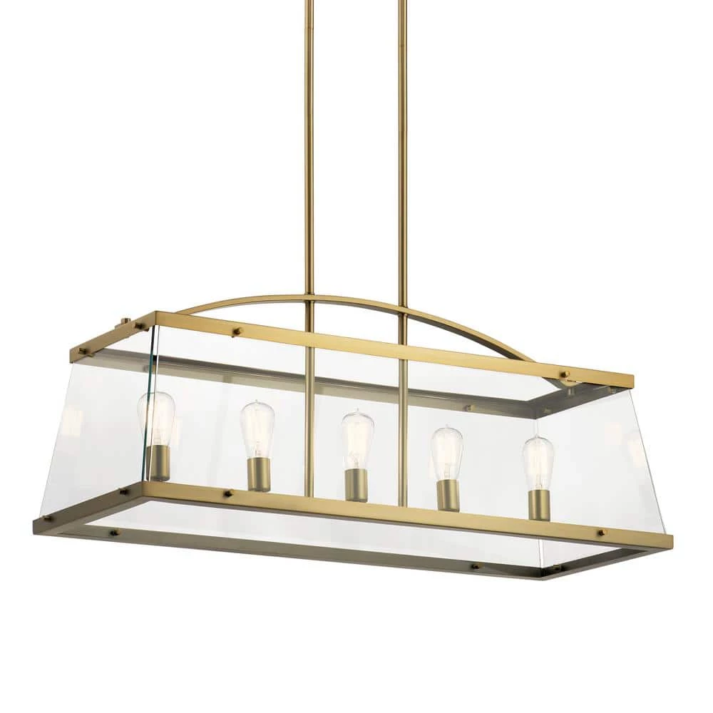 Illuminate your space creatively with the Darton 40.75 in. 5-Light Brushed Natural Brass Linear Chandelier. It has clear glass diffusers that provide bright illumination. With its natural brass frame finish, this chandelier fits in well with various styles of decor. It comes with a kit that enables convenient installation on sloped ceilings.