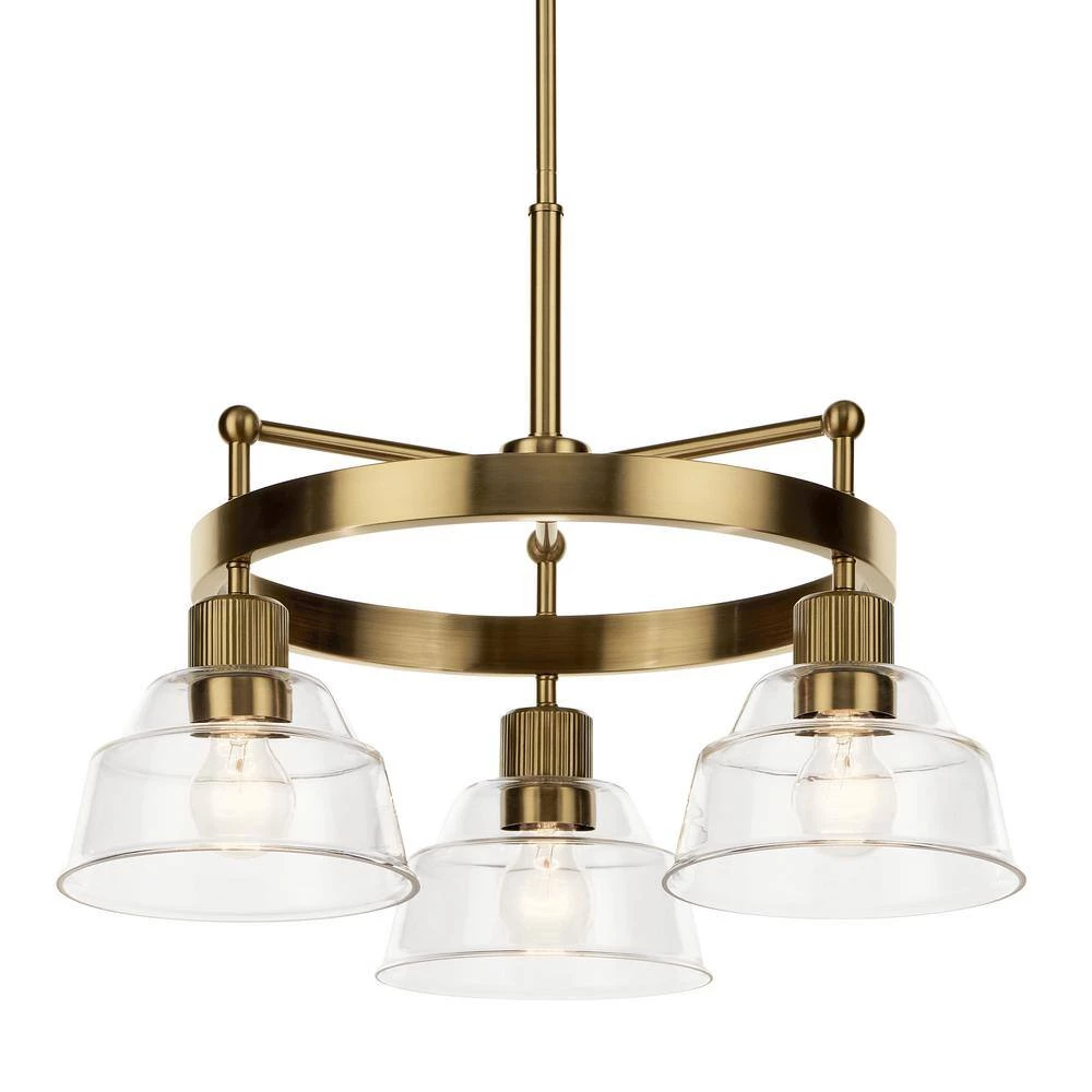 - The Eastmont 3 light chandelier features Brushed Natural Brass with fine ribbed detailing on the sockets and double-tiered Clear Glass shades