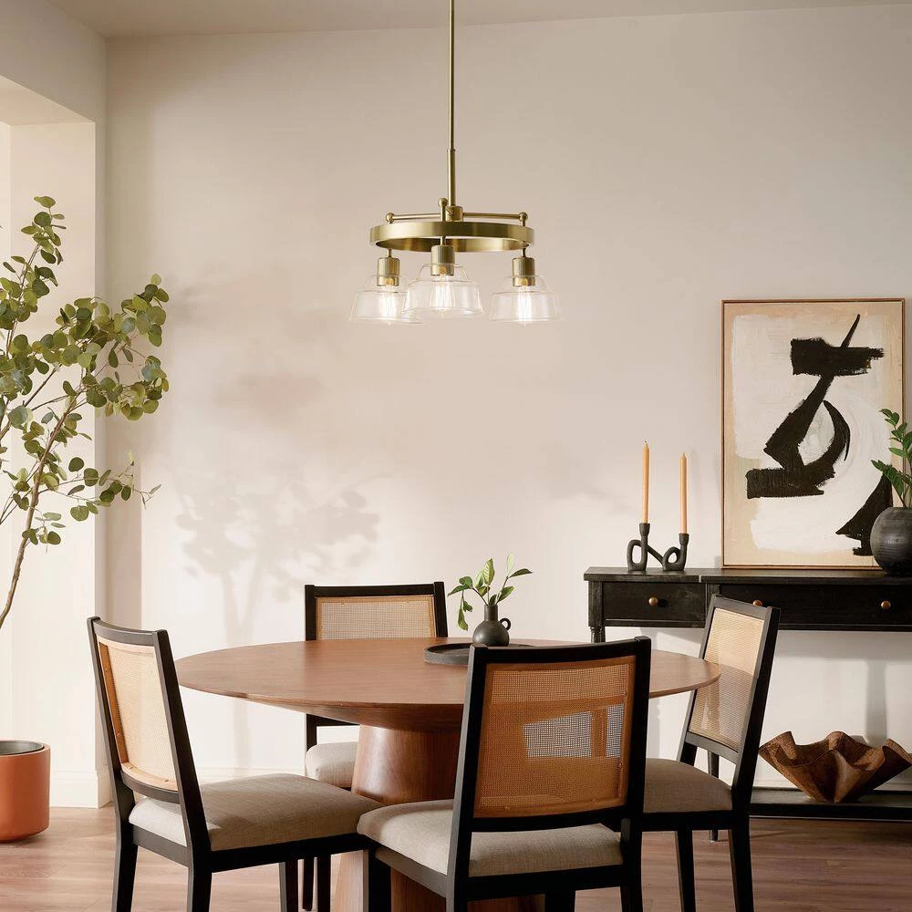 The Eastmont 3 light chandelier is undeniably remarkable. Brushed Natural Brass arms and fine ribbed detailing on the socket set the scene for the Clear Glass double-tiered shades, making this one of our most sophisticated and versatile fixtures. Its refined, luxe-industrial feel adds sophistication to a more vintage space, and alternately adds some edge to a modern space.