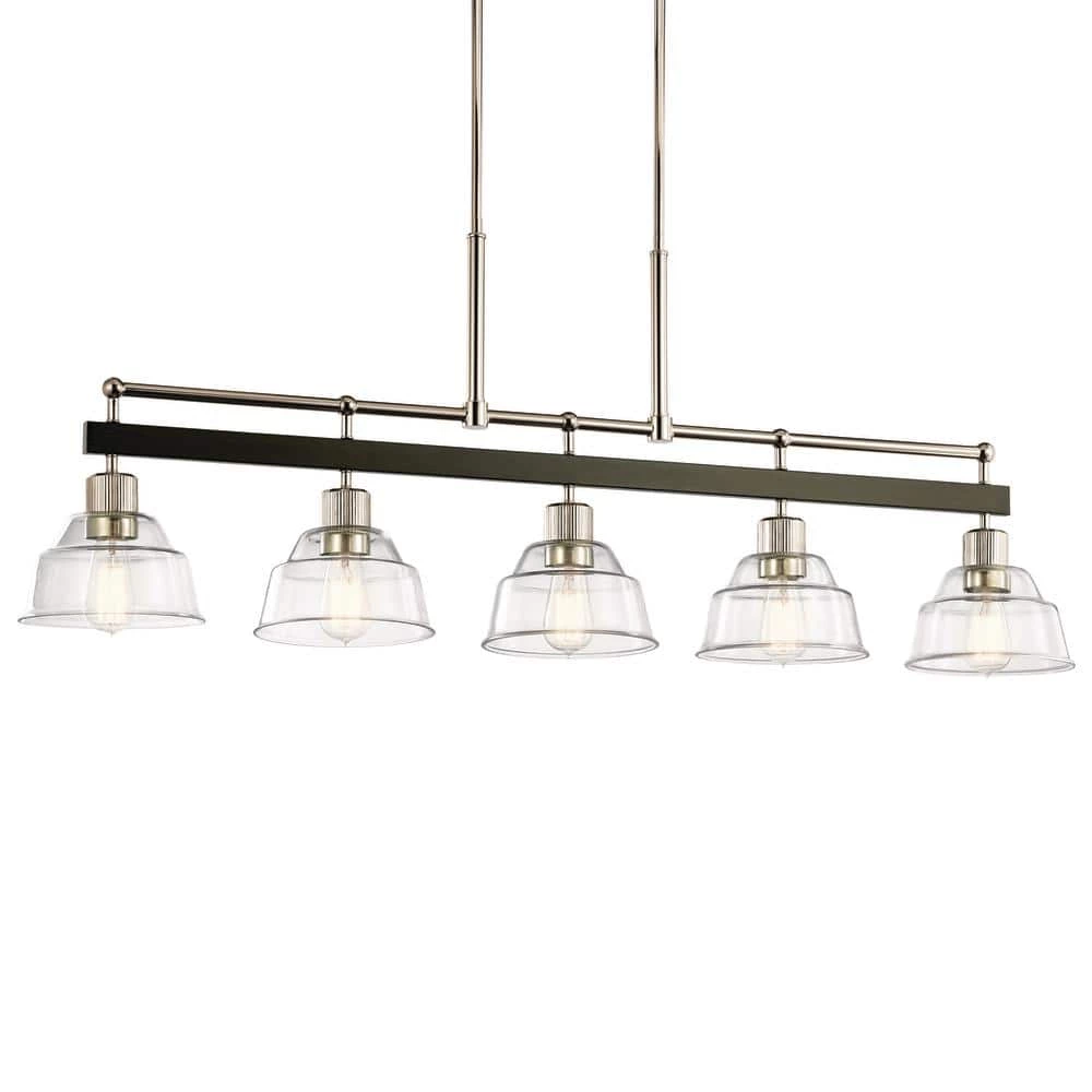 The Eastmont collection transforms classic into distinctive. Unmistakably sophisticated, undeniably alluring, Eastmont blurs the lines between luxury and rustic, industrial and vintage. How it shows up is entirely up to you. The Eastmont 5-light linear chandelier is undeniably remarkable. A Walnut Wood arm with Polished Nickel accents set the scene for the Clear Glass double-tiered shades, making this one of our most sophisticated and versatile fixtures.