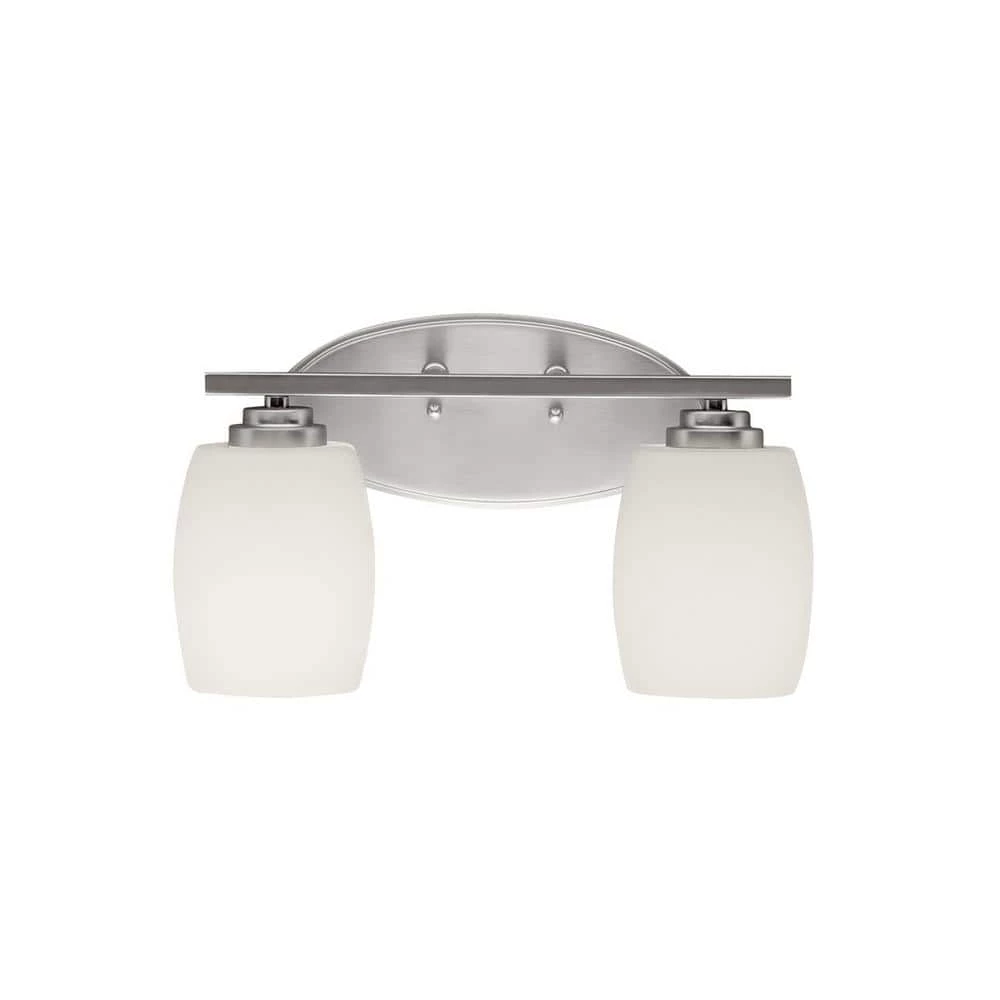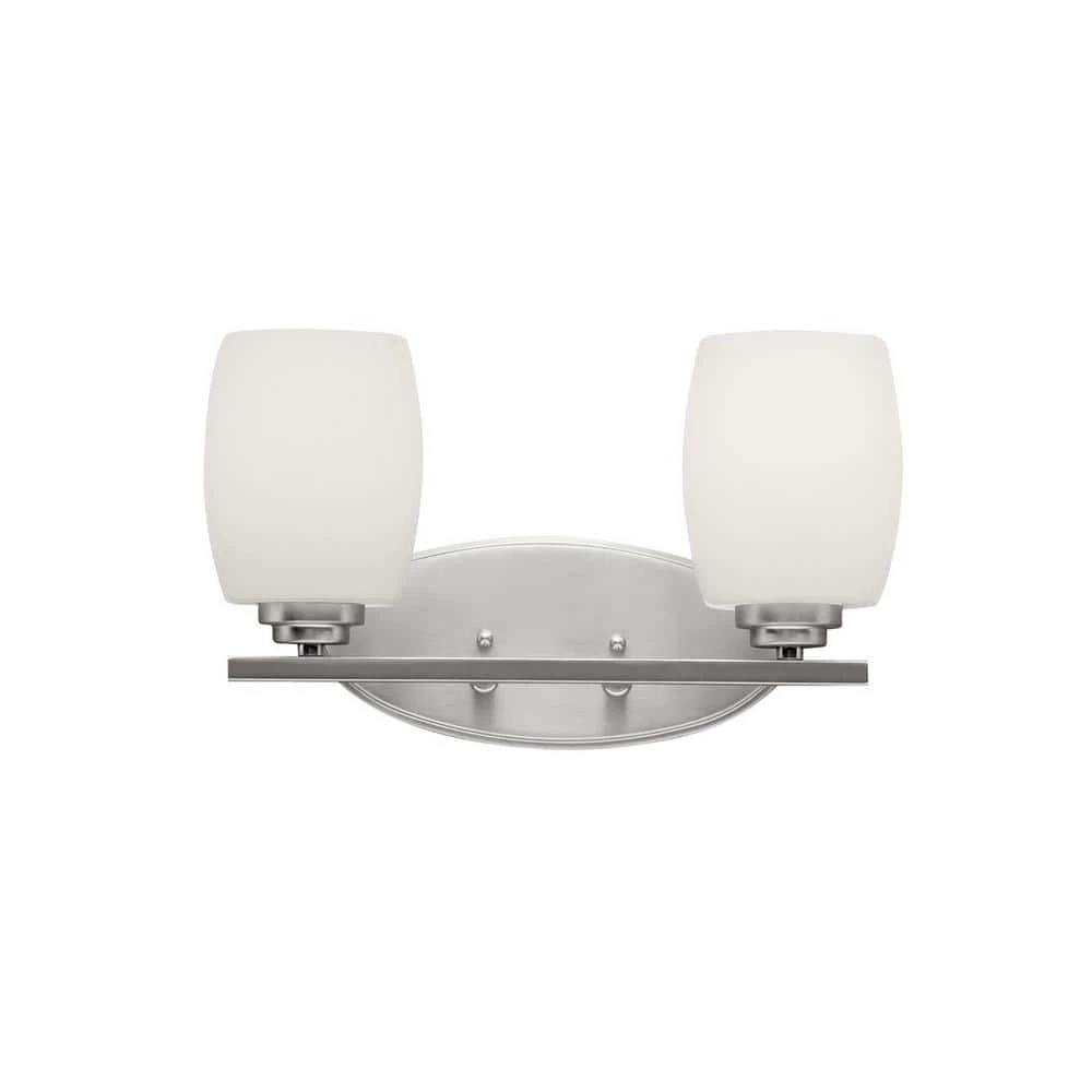 The KICHLER Eileen 2-Light 14.25 in. Brushed Nickel LED Vanity Light makes for an ideal choice to light up your bath space. It features a brushed nickel finish that resists corrosion. The etched opal glass of the vanity light provides soothing ambient lighting to your vanity or powder room. This vanity light comes with LED bulbs, which are Energy-Star certified for energy-efficient use. It allows for customizations of the glass shade. Face the lamp up to the ceiling for soft ambient lighting or face it down to highlight the mirror.