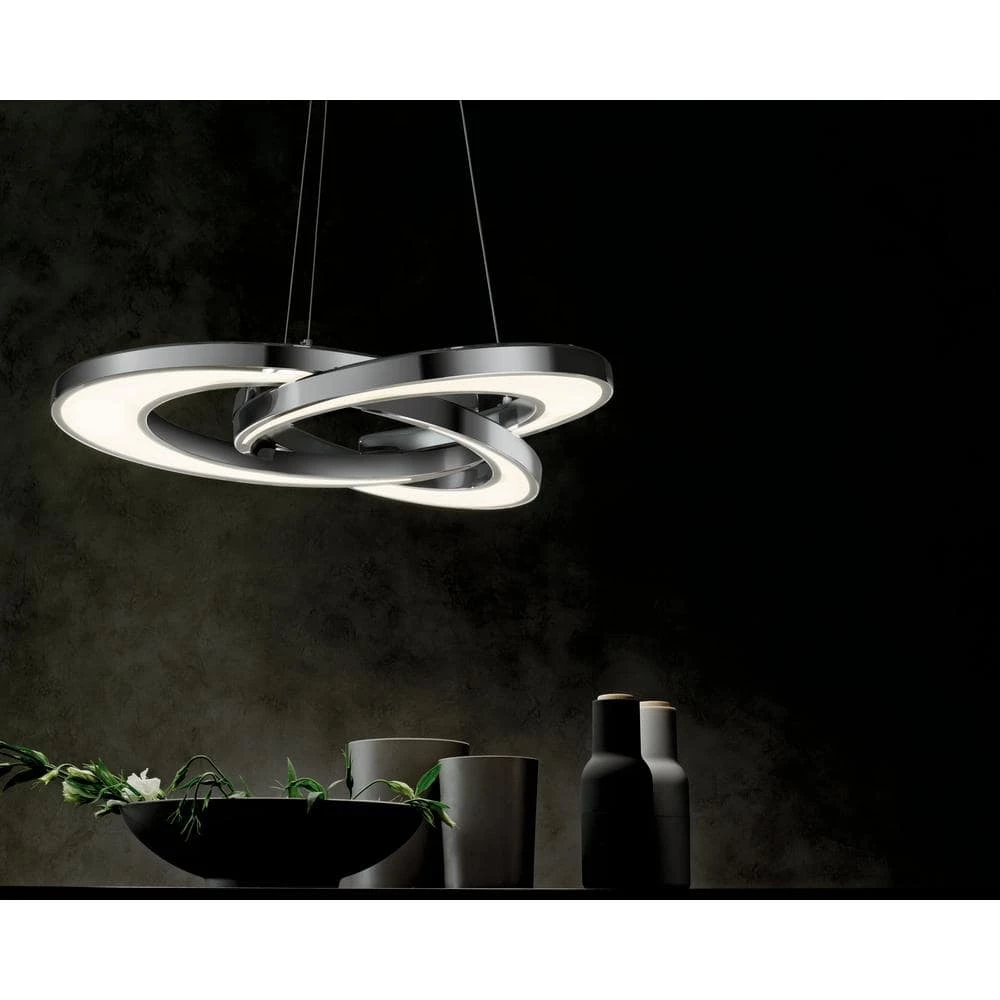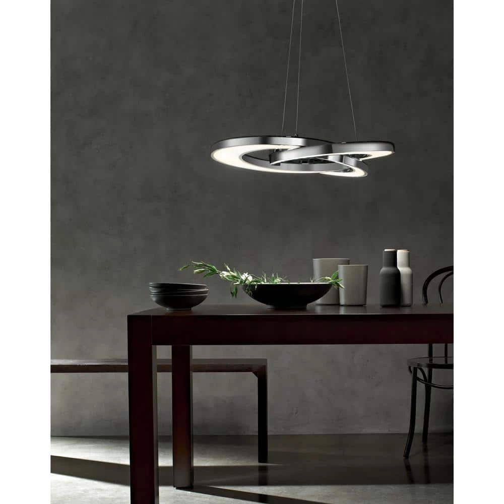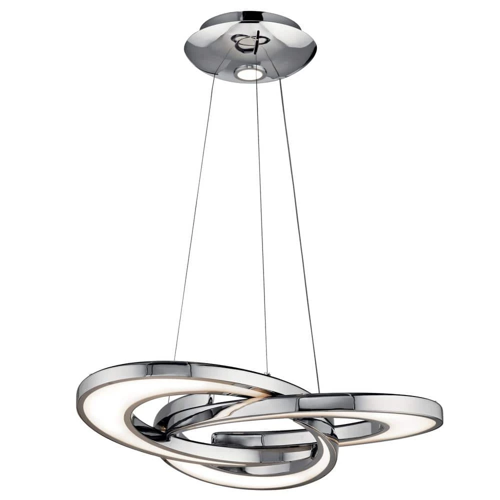 The KICHLER elan Destiny 27.75 in. Chrome LED Chandelier has a unique design that is inspired by the Borromean ring. Featuring 3 interlocking rings, this chandelier imparts contemporary style to your space. It has LED lights beneath the etched acrylic diffusers to create a soft glow. It also has a singular LED at the center that adds an extra focus of light for optimum illumination. These LED lamps are fully dimmable for convenient use. This ETL-listed chandelier is suitable for use in dry locations, making it an excellent addition to your dining room, living room, bedroom and more