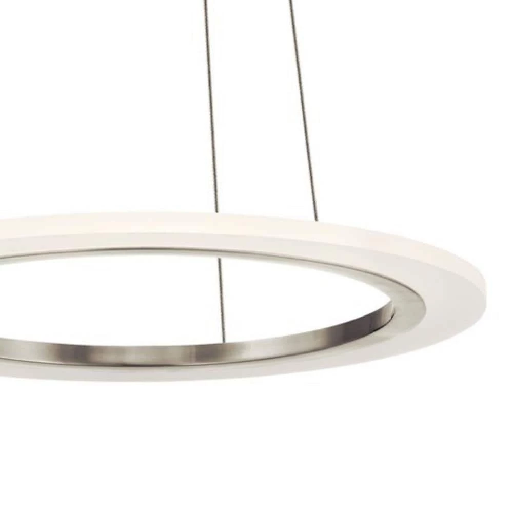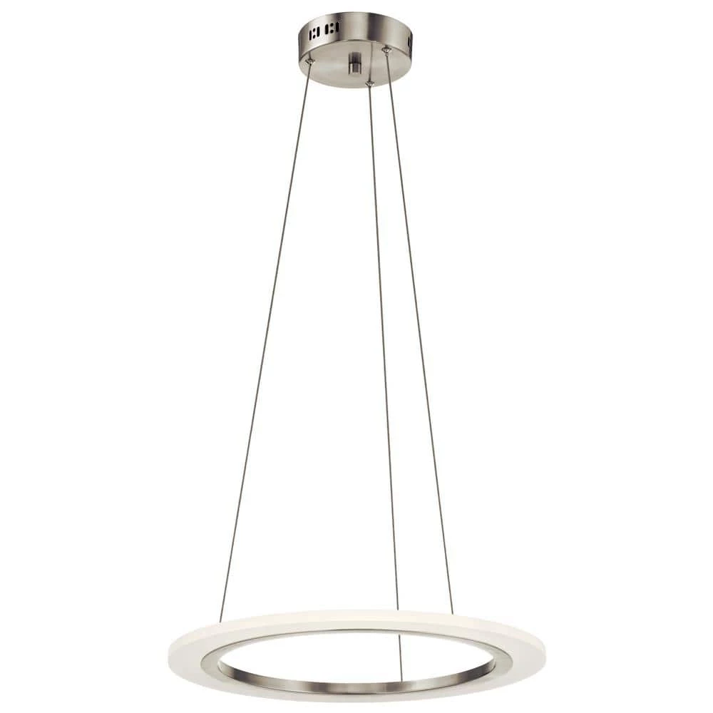 The KICHLER elan Hyvo 1-Ring LED Pendant has an attractive brushed nickel finish that adds a level of charm to your contemporary space. It features a single ring with an etched white acrylic diffuser rim for a soft, warm glow when illuminated. The dimmable option lets you control the brightness according to your needs. This pendant light is ETL listed for safe use in dry locations like dining rooms, living rooms, bedrooms and more.