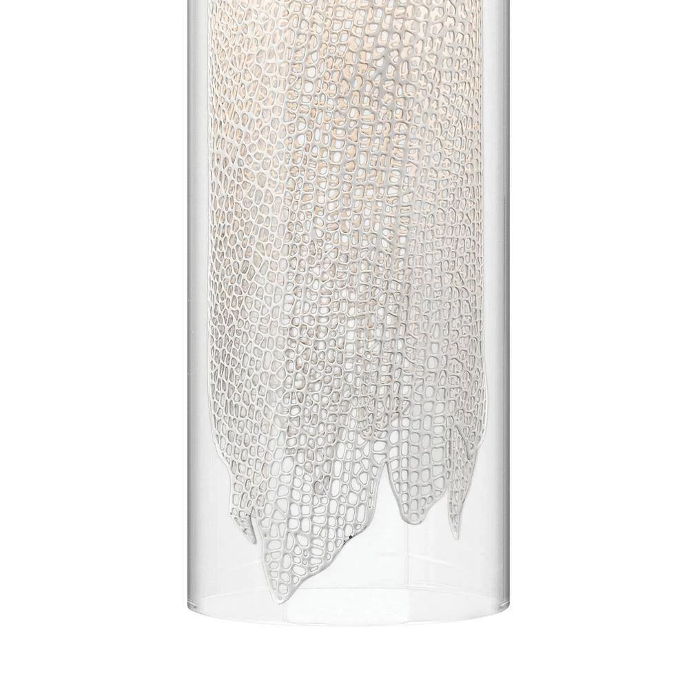 - Clear glass shade with white metal filigree for soft ambient light appeal
