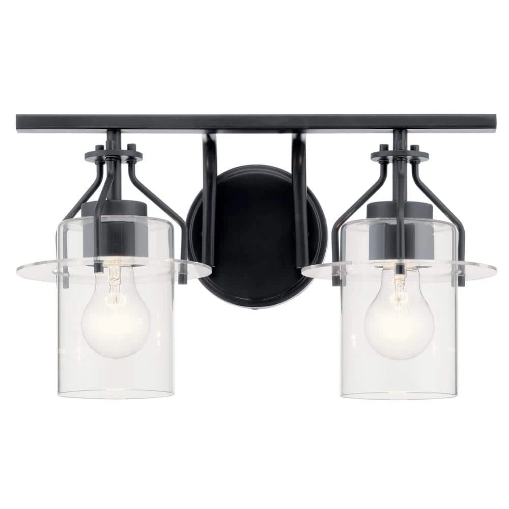 The Everett 16 inch 2 light vanity light adds a dash of industrial glam above your bathroom mirror. Two mini Clear Glass pendants are suspended from curved arms and round backplate in Black. Look closely, and you’ll see delicate discs hold each pendant – and your attention.