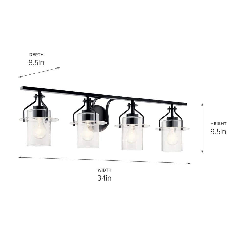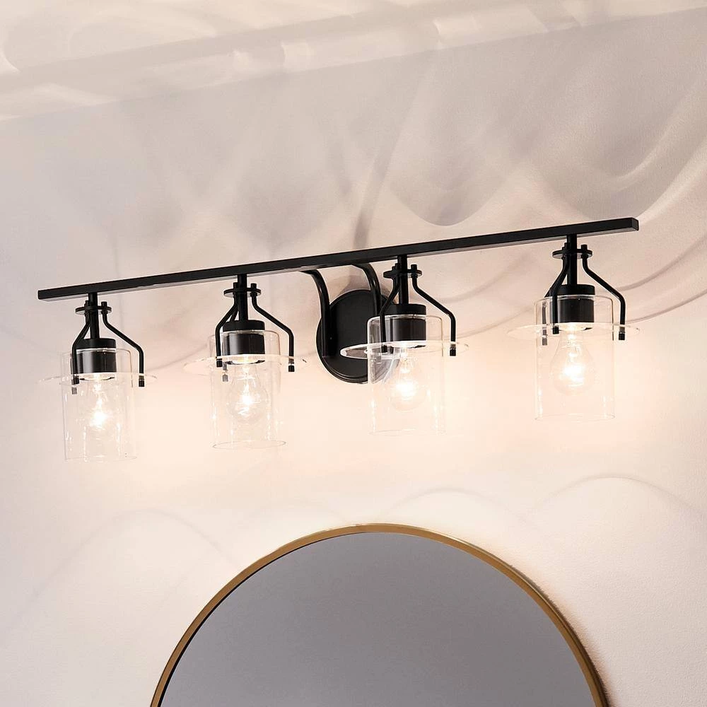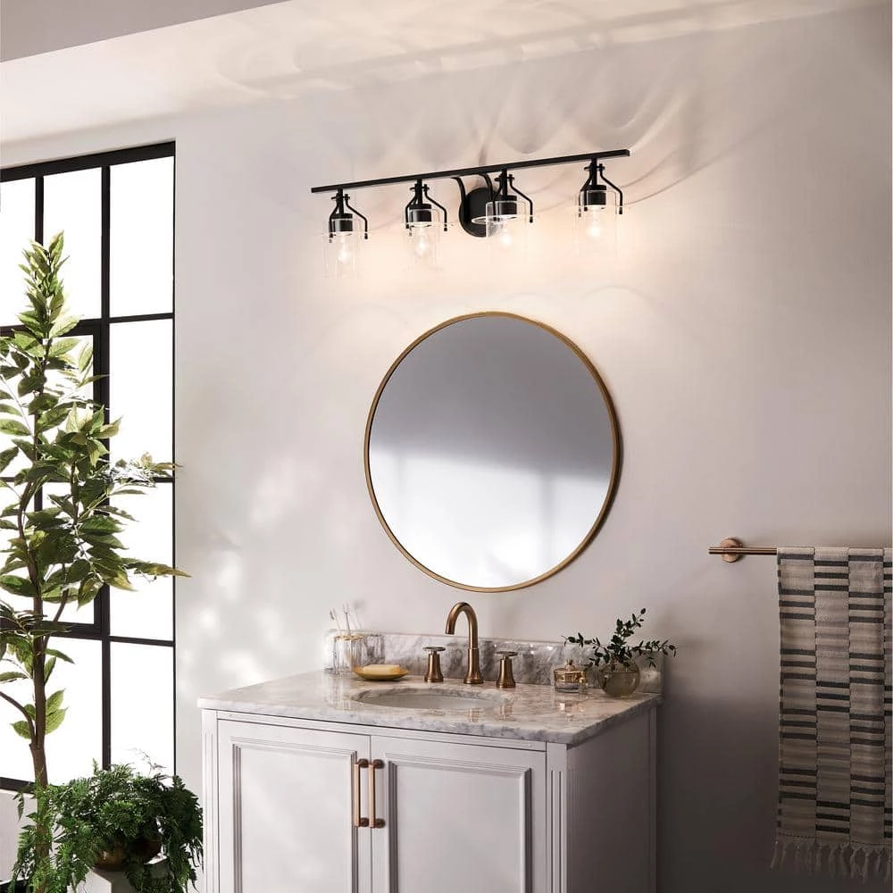 The Everett 34.25 inch 4 light vanity light adds a dash of industrial glam above your bathroom mirror. Four mini Clear Glass pendants are suspended from curved arms and a round backplate in Black. Look closely, and you’ll see delicate discs hold each pendant – and your attention.