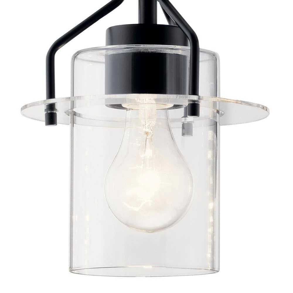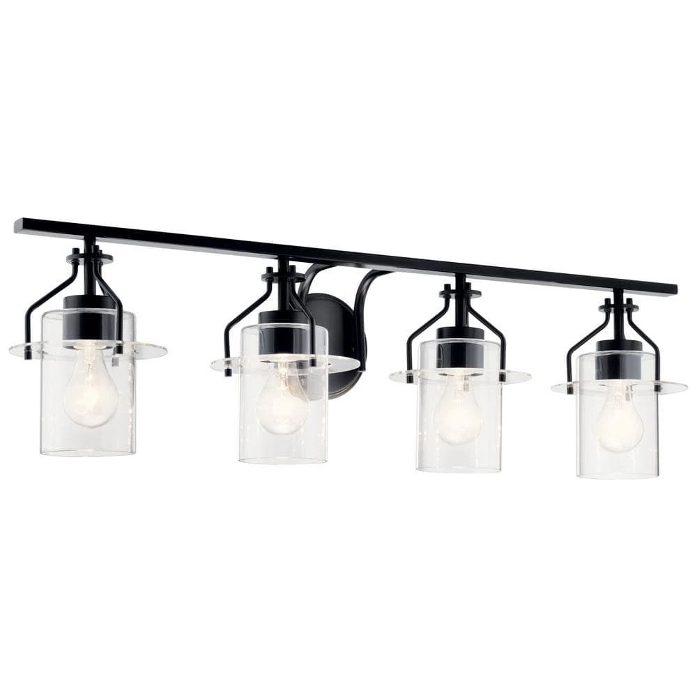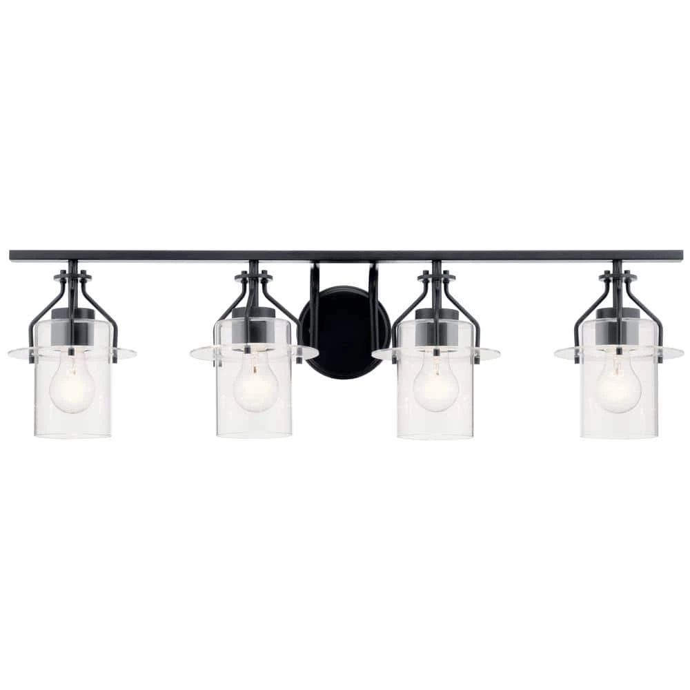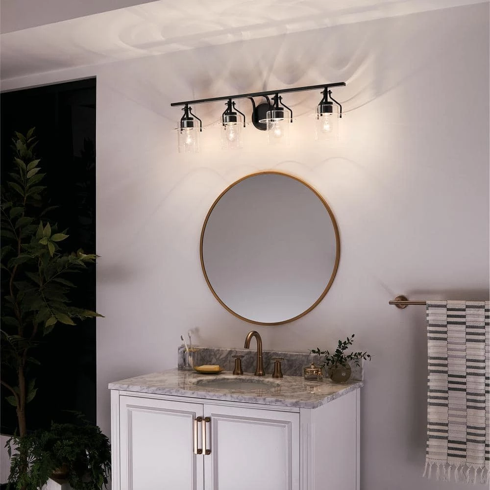 The Everett 34.25 inch 4 light vanity light adds a dash of industrial glam above your bathroom mirror. Four mini Clear Glass pendants are suspended from curved arms and a round backplate in Black. Look closely, and you’ll see delicate discs hold each pendant – and your attention.