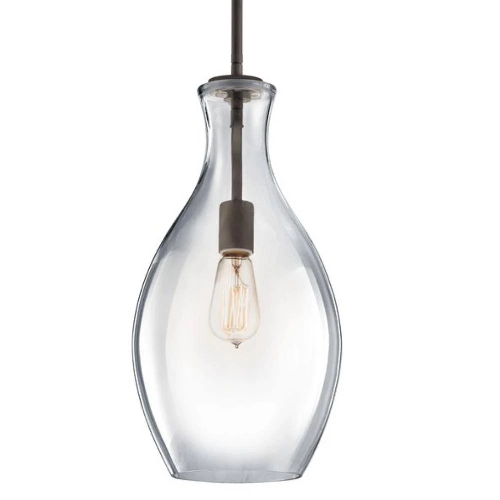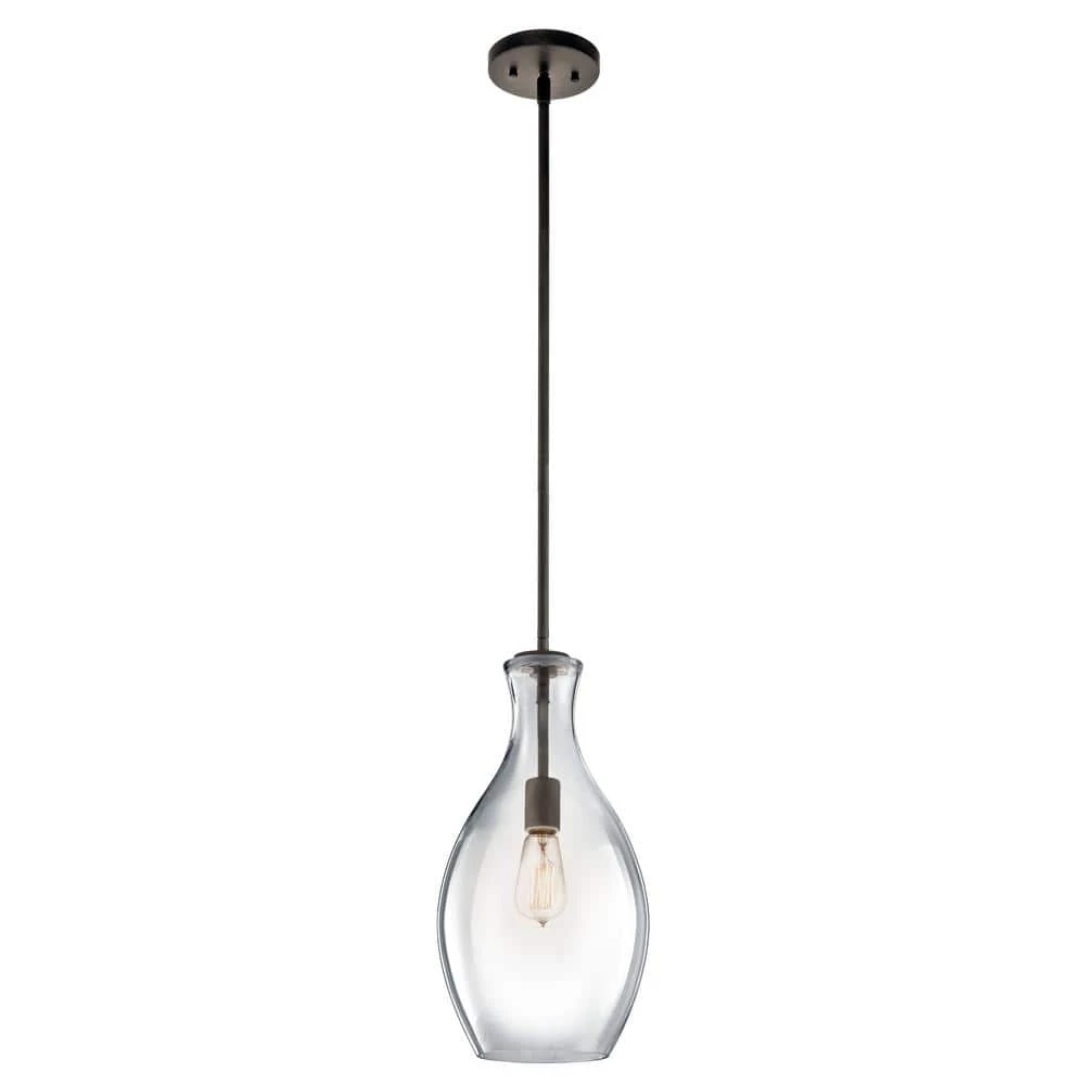 Featuring an hourglass-shaped clear glass blown shade, the KICHLER Everly 17.75 in. 1-Light Olde Bronze Hour Glass Pendant Light emits an opulent glow. It has a bronze finish that complements most types of interior arrangements. With its customizable design, you can install this fixture individually or place a few of them at varying heights to enrich your decor. This pendant light from KICHLER enhances the visual appeal of your living space.