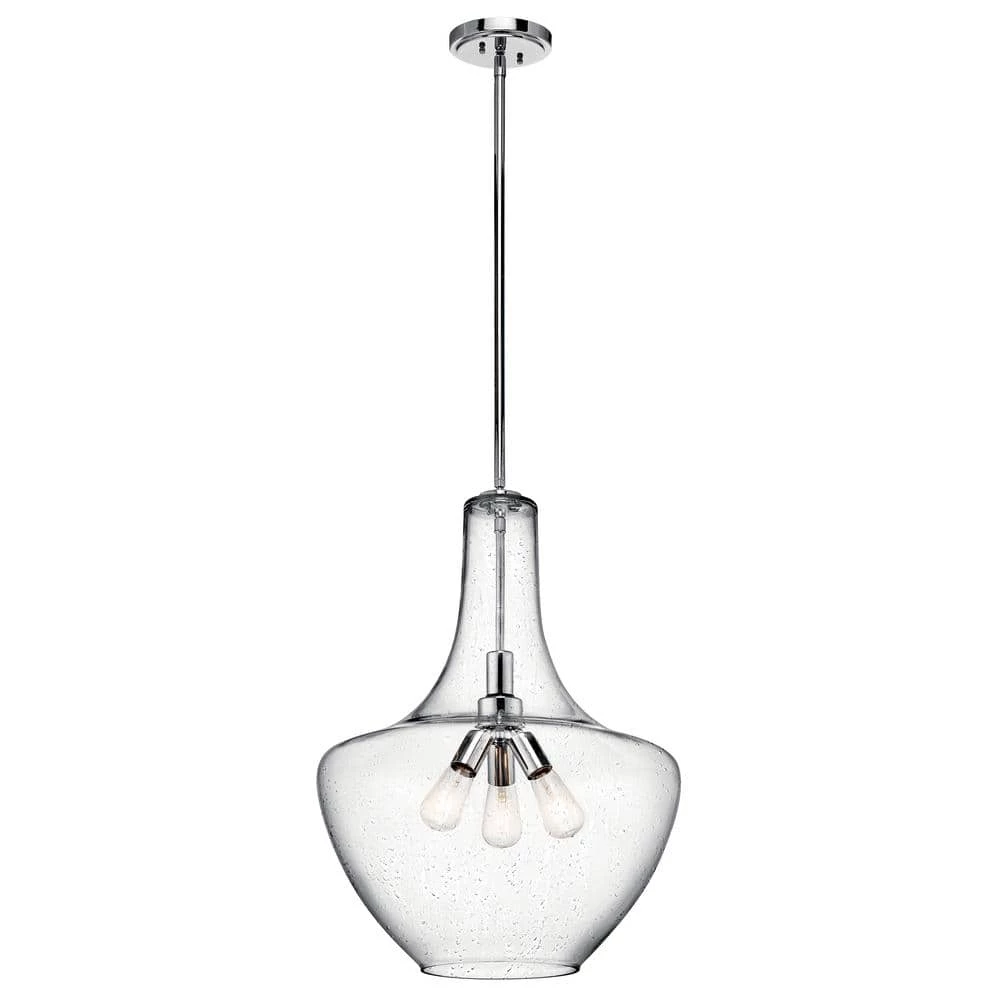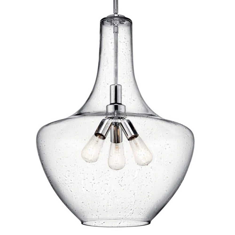 Brighten up your living space with the KICHLER Everly 27.5 in. 3-Light Chrome Bell Pendant Light. The bell-shaped, clear seeded glass blown shade emits bright glow to highlight your decor. This pendant light has a chrome finish that complements most types of interior arrangements. With its customizable design, you can install this fixture individually or place a few of them at varying heights to enrich your decor. This pendant light from KICHLER is sure to enhance the visual appeal of your living room, bedroom, or more.