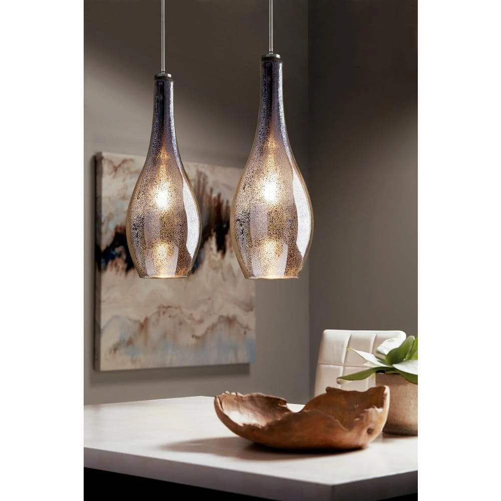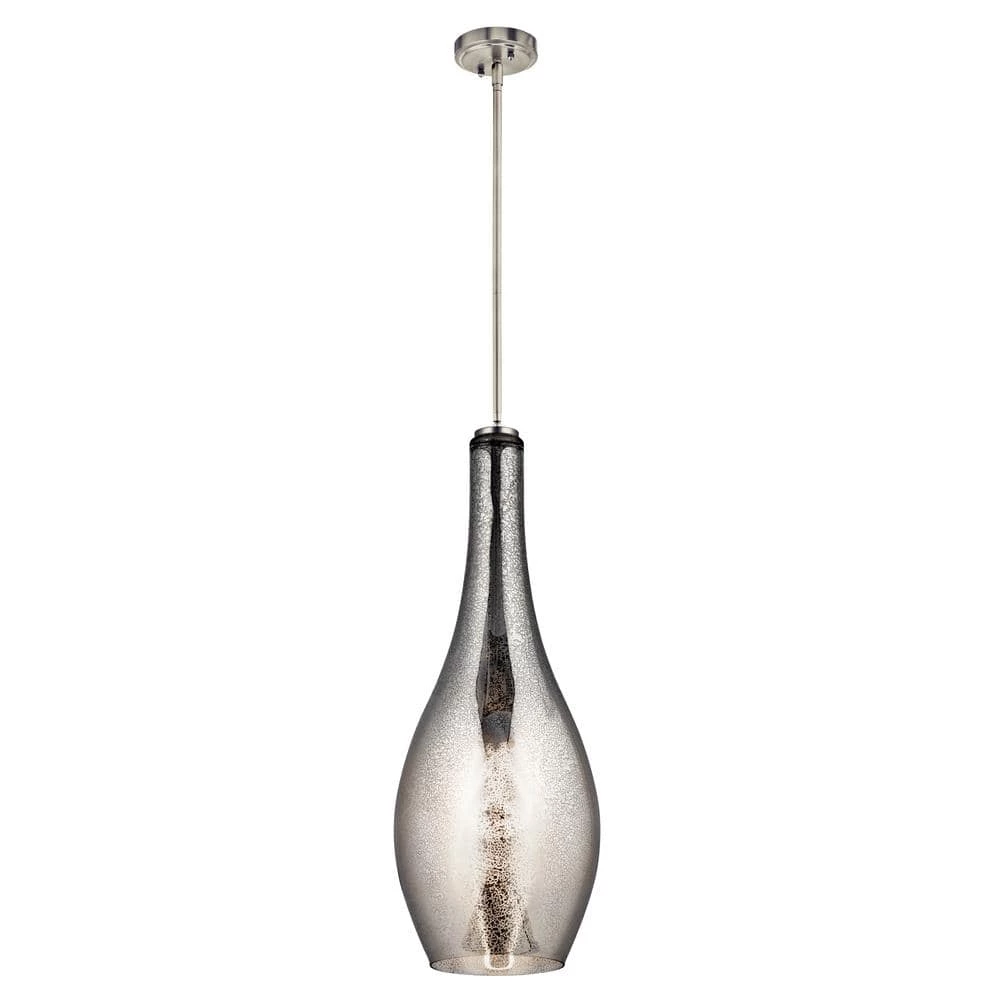 Enliven your decor with the KICHLER Everly 29.5 in. 1-Light Brushed Nickel Teardrop Pendant Light. It features a teardrop-shaped, mercury glass blown shade for an enhanced visual appeal. The brushed nickel finish of this fixture complements most types of interior arrangements. With its customizable design, you can install this fixture individually or place a few of them at varying heights to enrich your decor. This pendant light from KICHLER is sure to highlight your living room, bedroom, or more.
