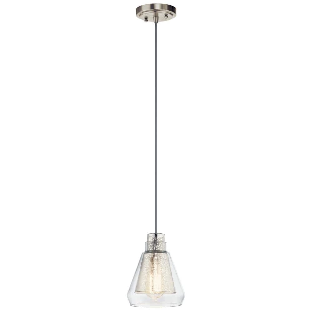 Upgrade your living space with the Kichler Evie 7.75 in. 1-Light Brushed Nickel Mini Pendant Light. Featuring a dual-layered globe with a clear glass outer shade and a mercury glass diffuser, this light offers a radiant glow to your living space. Its brushed nickel finish seamlessly blends with all types of decor. This magnificent pendant light from Kichler makes for an ideal lighting solution for your living room, bedroom, or more.