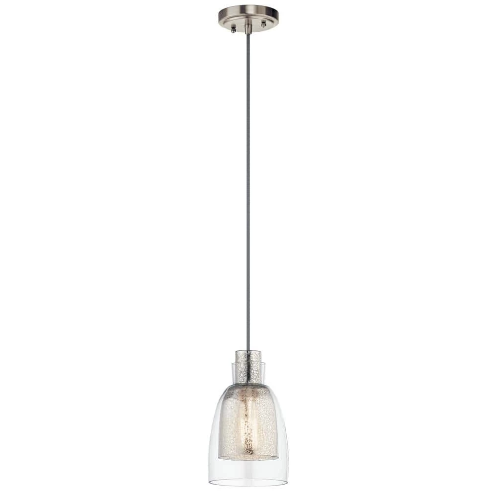 Upgrade your living space with the Kichler Evie 9.5 in. 1-Light Brushed Nickel Mini Pendant Light. Featuring a dual-layered globe with a clear glass outer shade and a mercury glass diffuser, this light offers a radiant glow to your living space. Its brushed nickel finish seamlessly blends with all types of decor. This magnificent pendant light from Kichler makes for an ideal lighting solution for your living room, bedroom, or more.