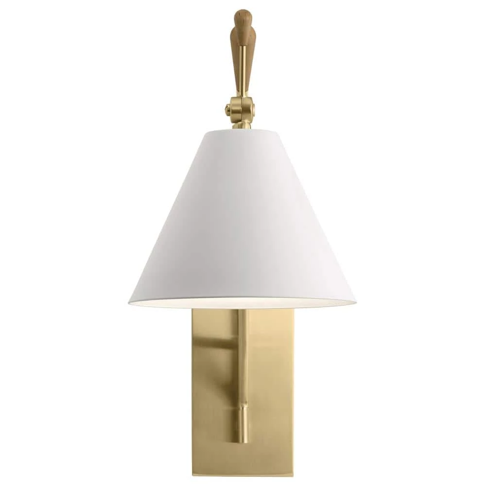 Some are meant to transcend the ordinary. Meet Finnick-more than a light, Finnick is art. Dismissing the utilitarian, it embraces creativity and uniqueness. It’s contemporary and clean, decorative and refined. The Finnick 20 in. 1-light wall sconce is a decorative light featuring Champagne Gold arms with Natural Maple accents. The attached White shade and head move vertically and the entire fixture swivels from side to side. Direct the light just where you want it and embrace modern individuality.