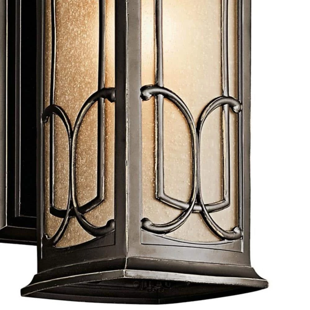 The Kichler Franceasi 18 in. 1-Light Olde Bronze Outdoor Wall Light features intricate details that suit a wide range of decor options. Its light umber seeded glass panels diffuse light to cast a warm and relaxing glow. This wall light creates a distinctive shadow pattern on your entryway, garage door, patio, porch, and more. It is crafted of aluminum to ensure durability and-years of reliable use.