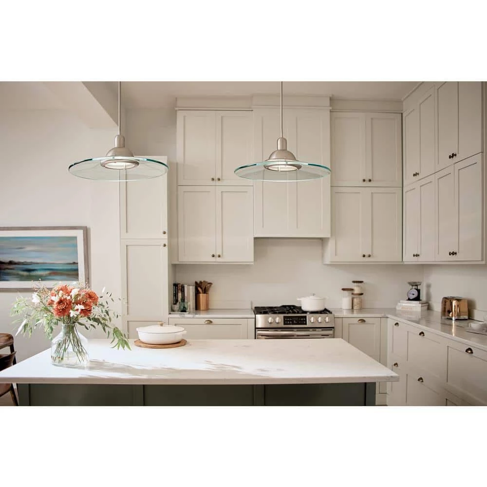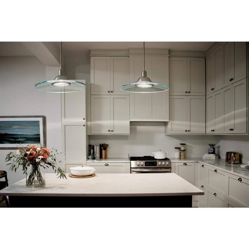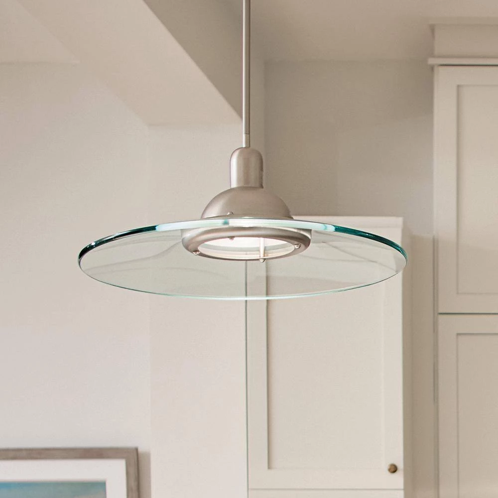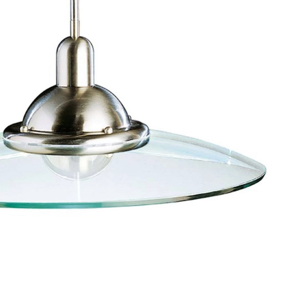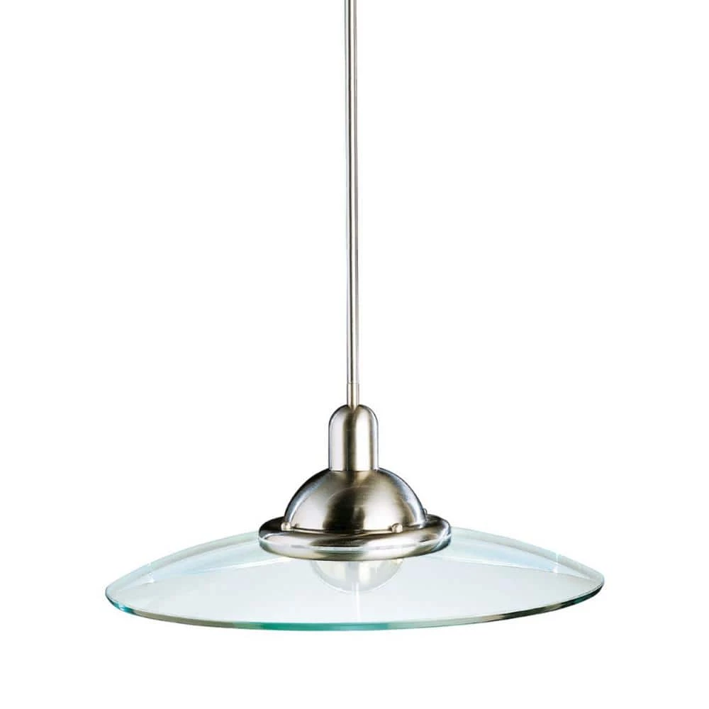 The Kichler Galaxie 22.5 in. 1-Light Brushed Nickel Mini Pendant Light adds a touch of contemporary style to your space. It features a 5 in. thick clear glass saucer that provides ample ambient lighting for your living room. With its brushed nickel finish, this light fixture complements various styles of decor. This pendant light from Kichler makes for an ideal lighting solution for your living room, bedroom, study room, or more.