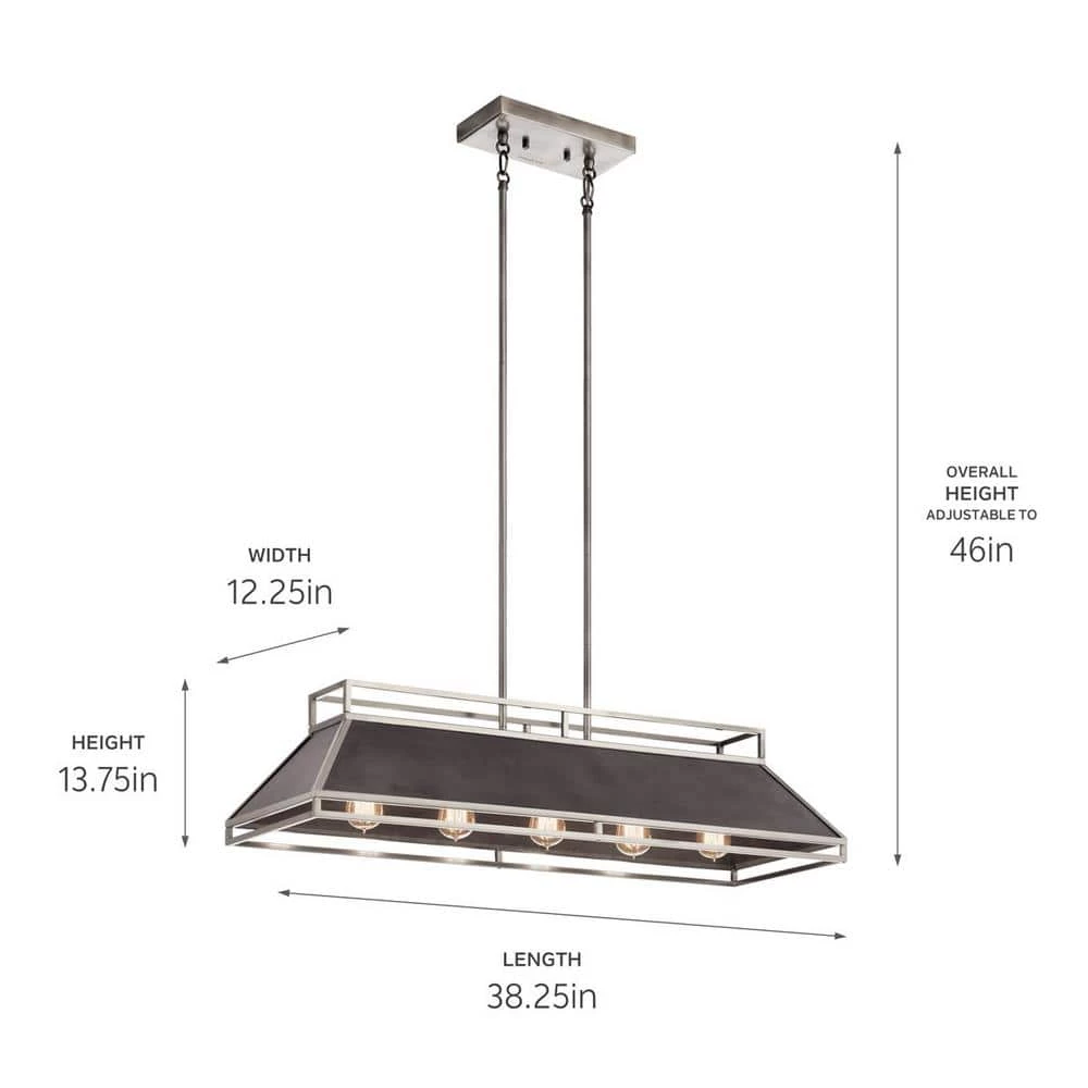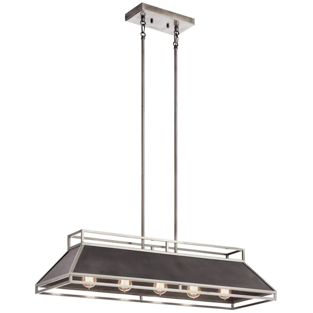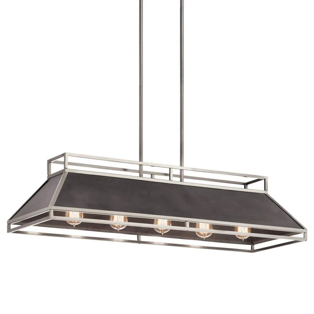 The Kichler Grendel 5-Light Classic Pewter Linear Chandelier features a kitchen-vent inspired design. It holds five incandescent bulbs to provide optimal illumination. The open metal framework helps direct strong light downward and soft, ambient light towards the ceiling. With a classic pewter frame finish, this chandelier adds industrial-style elegance to your decor.